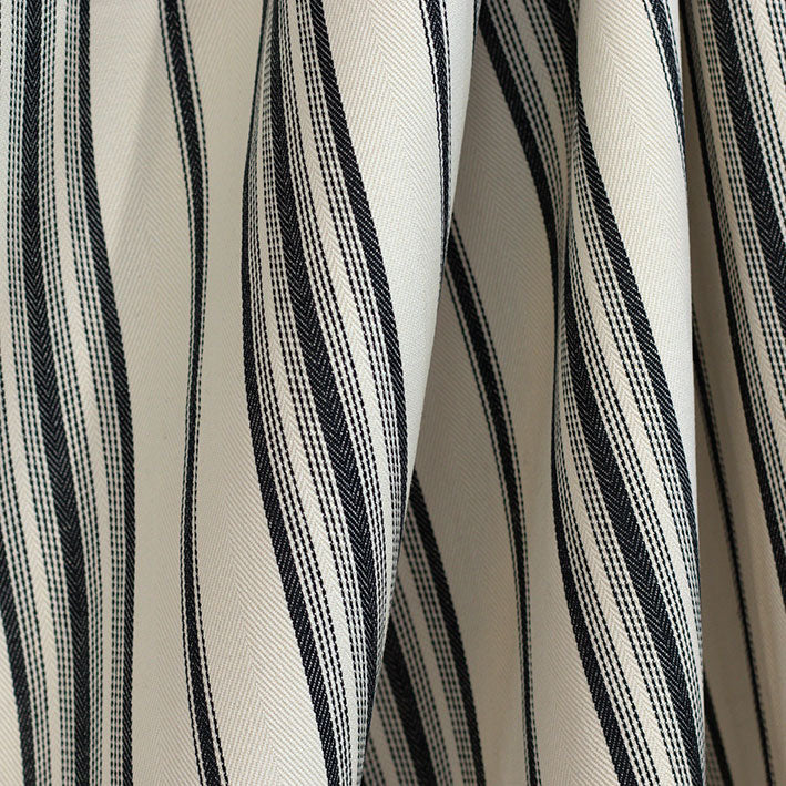 Onyx Twill Stripe is a versatile fabric featuring a stripe design in black and cream. Beautiful soft cotton. Suitable for everything including curtains, cushions, and home accessories!