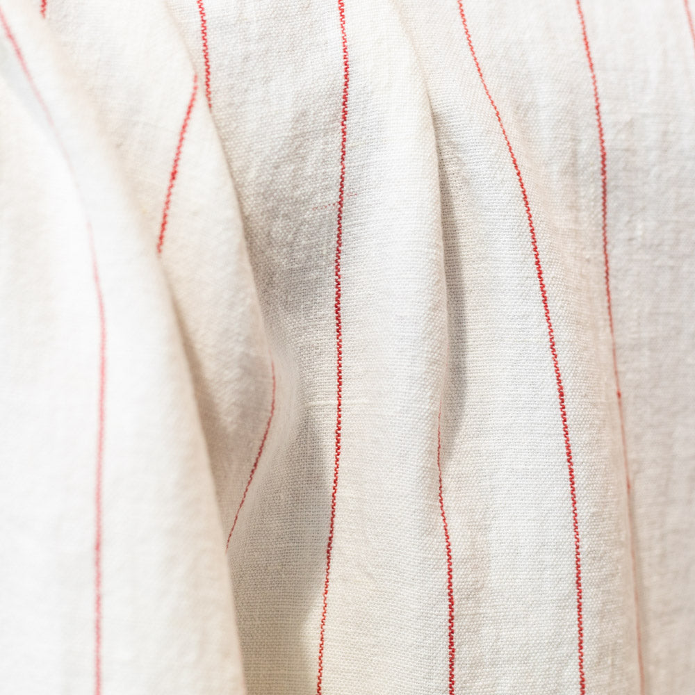Vis Linen Red is a wonderfully classic white linen featuring thin red stripes. This midweight fabric would hang as beautiful subtly patterned curtaining, cushions or even use on your occasional upholstery projects. Also suitable for other home furnishings such as napkins, tablecloths, and tea towels.