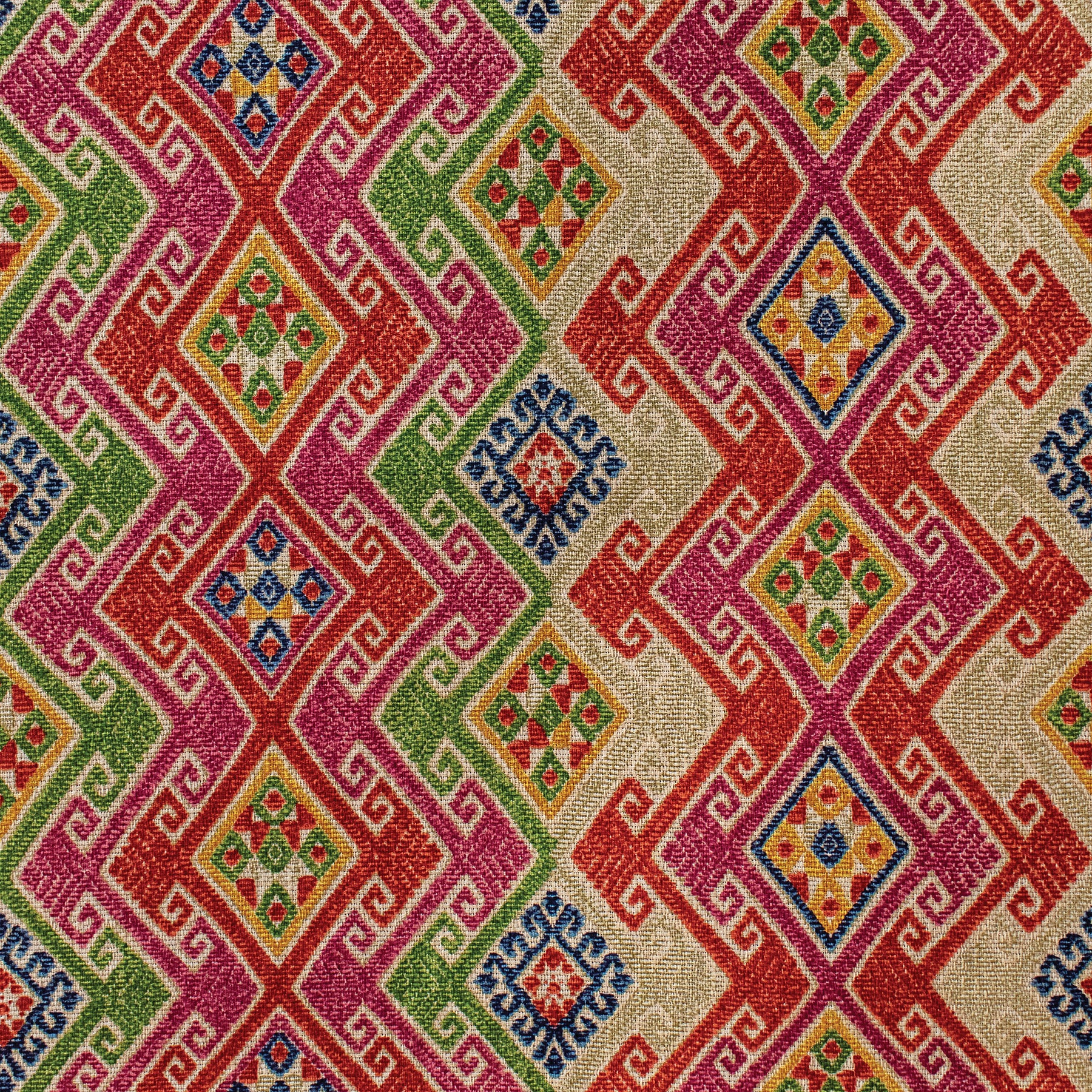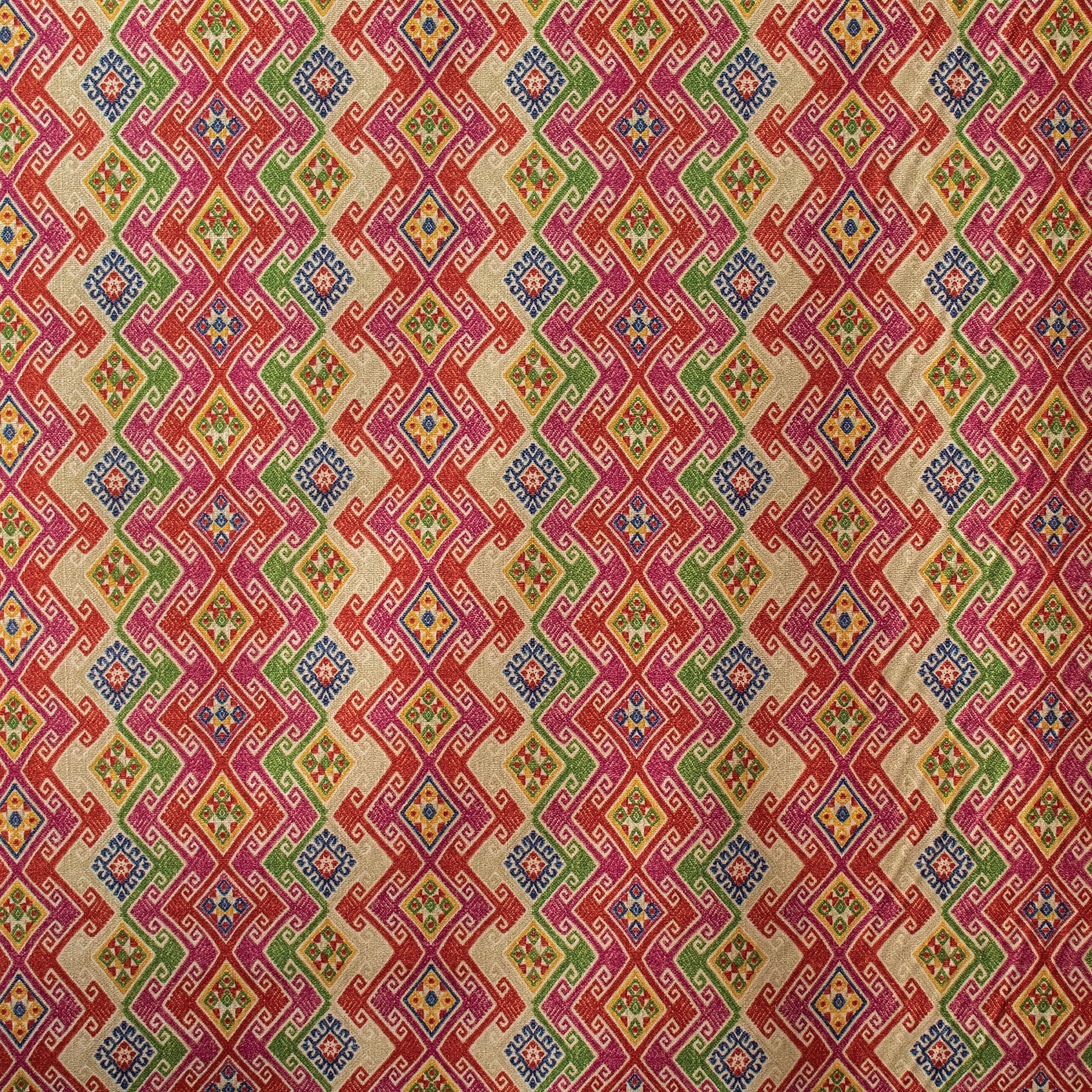 Kuzco is a richly detailed design featuring diamond-shaped motifs filled with intricate detailing and framed by a Greek key–style border. This cotton fabric showcases a vibrant palette of primary colours. The combination of bold colours and geometric precision creates a striking, eye-catching aesthetic perfect for cushions, curtains, or occasional upholstery. This fabric adds texture, pattern, and personality to any interior, making it ideal for both traditional and eclectic spaces.