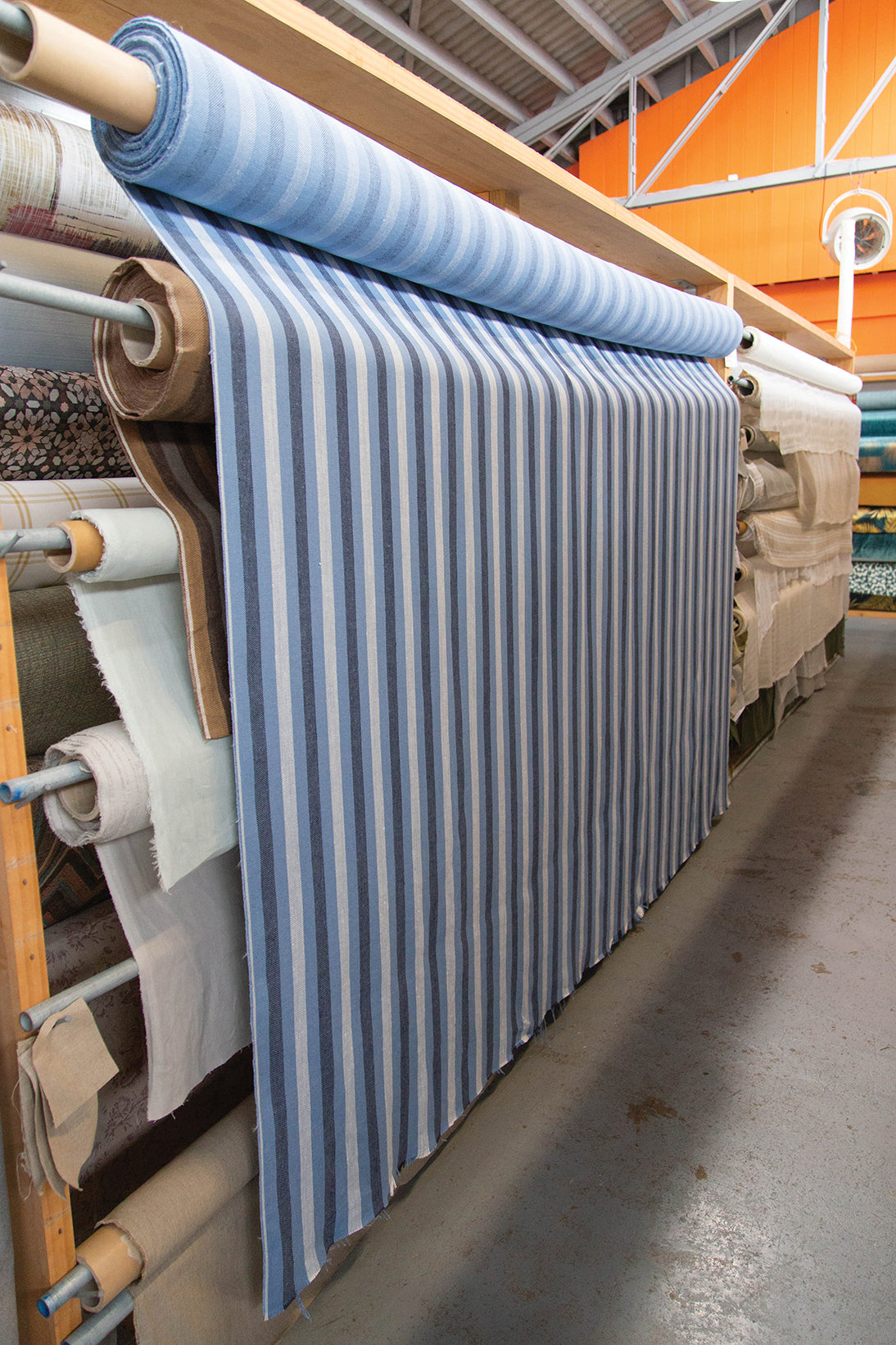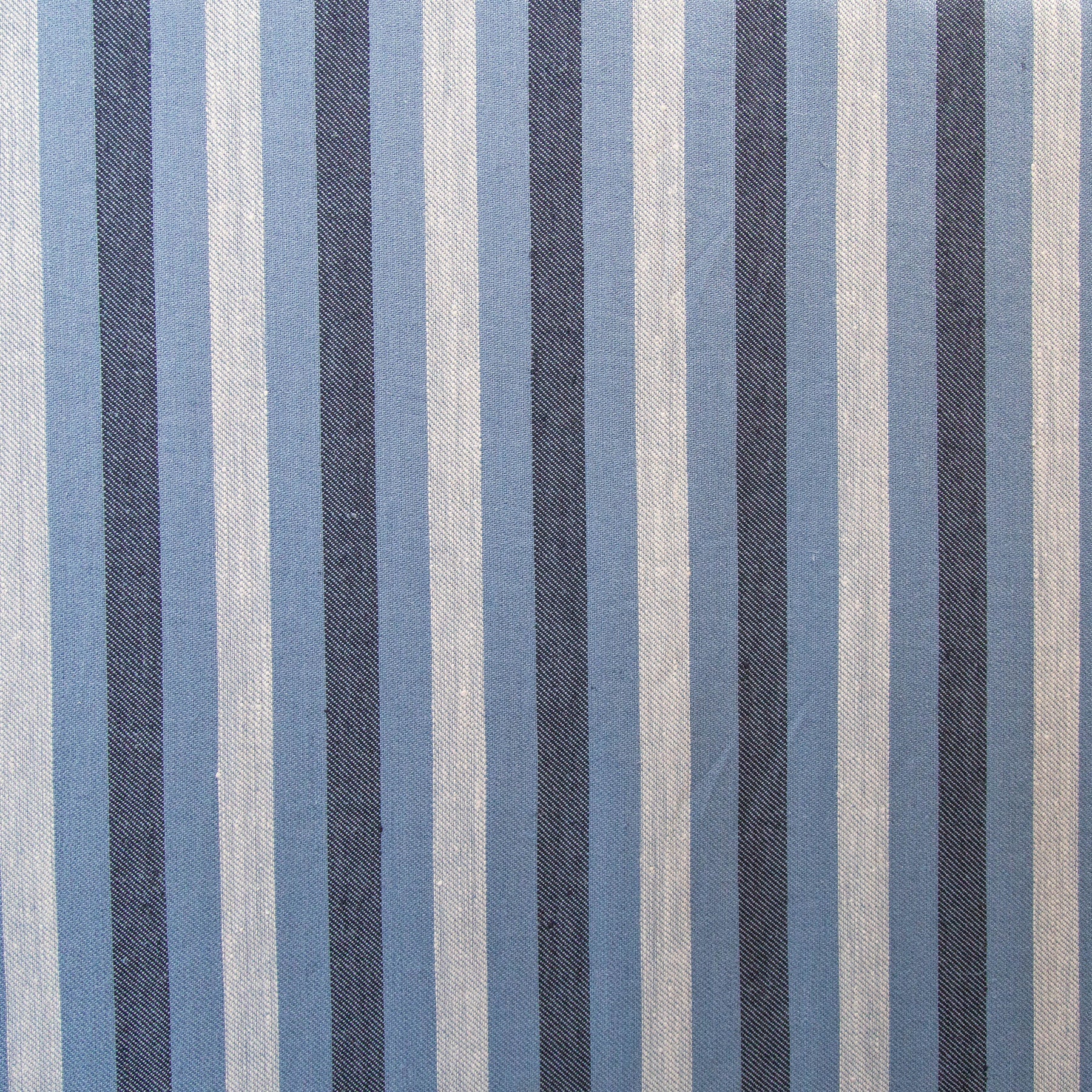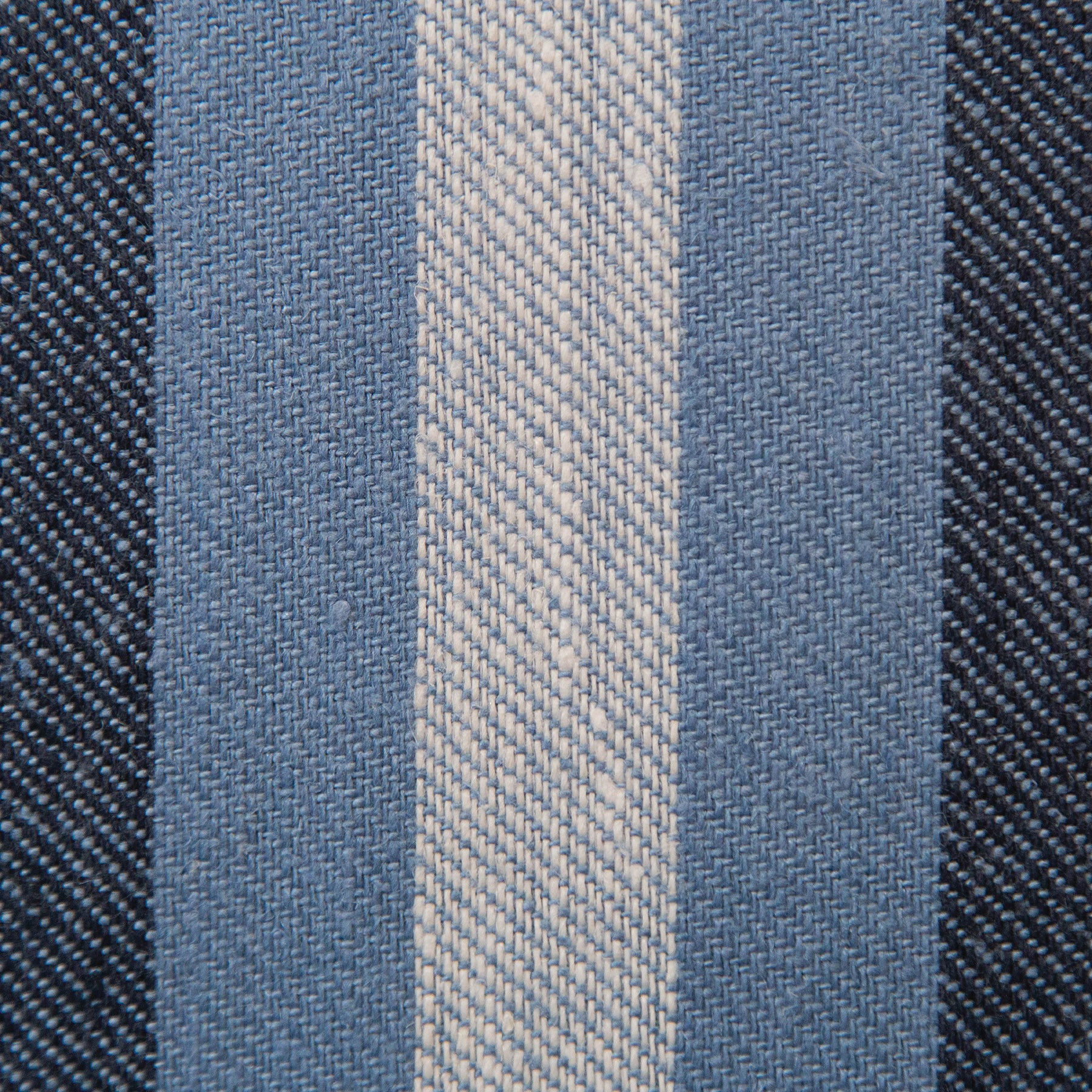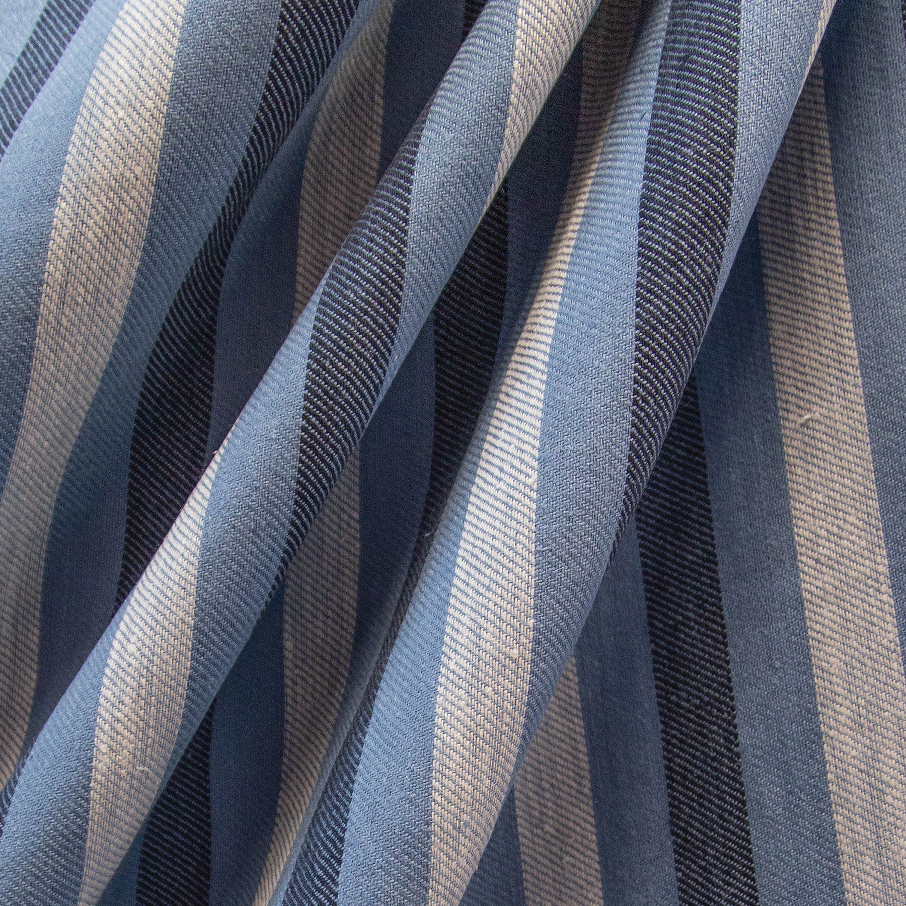 Bright and bold, this classic white, baby blue and dark blueberry stripe wide width fabric is perfect for everyday upholstery use, curtains, and cushions.
