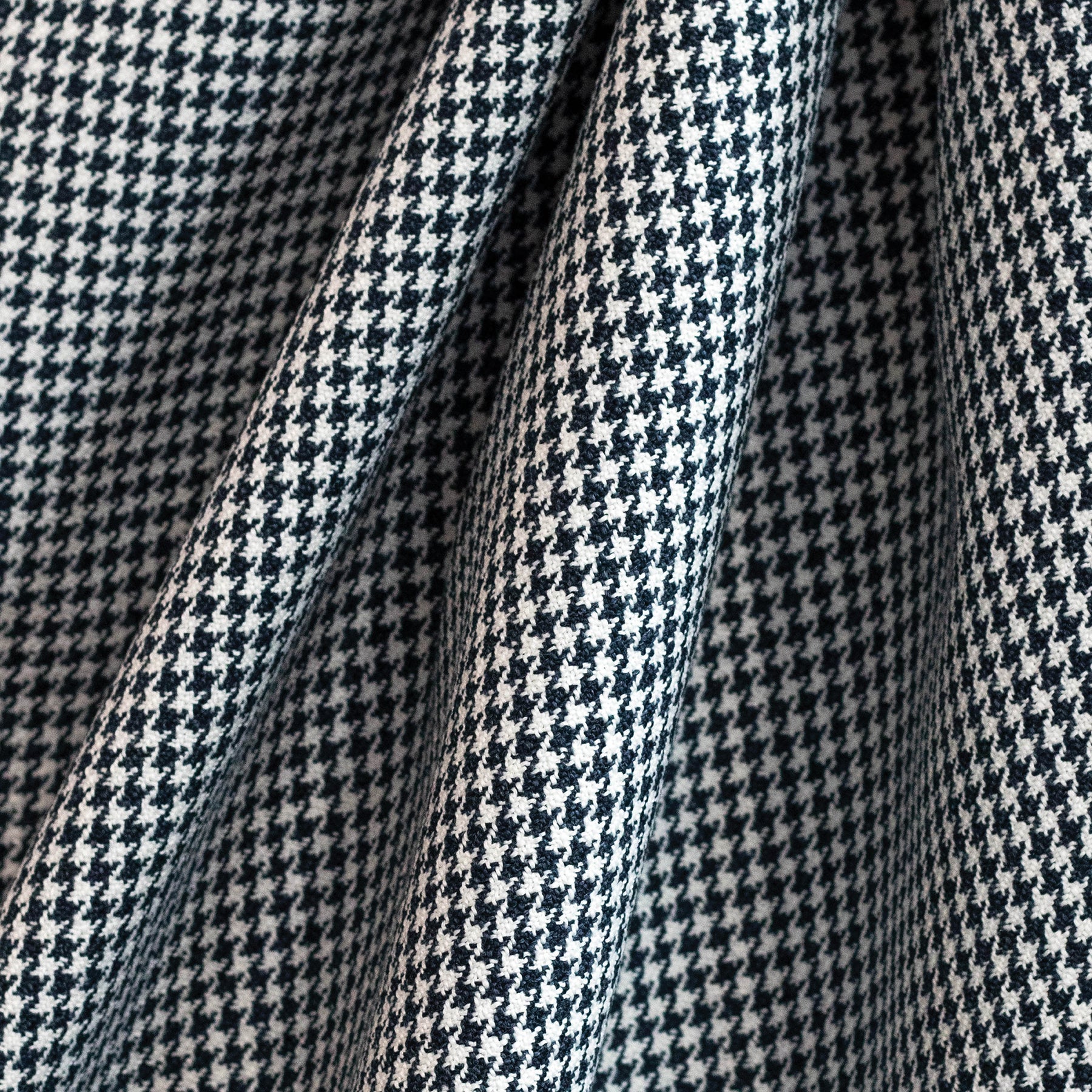 Our popular 'Chompers Cinnabar' now has a Navy counterpart! This fabric is a fantastic small scale houndstooth in a brilliant deep navy and white. With its composition being polyester and acrylic blend it is the perfect choice for heavy use upholstery projects, or as a pop of colour in cushions!