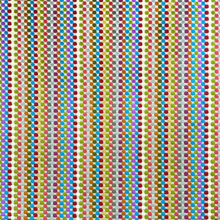 Gumdrop is a fun multicoloured woven jacquard fabric that features an overall pattern of chenille spots, with alternating colours forming stripes. The bright multitude of colours makes this fabric a statement piece you will have to have in your home. Perfect for everyday use upholstery and cushions, but also great for heavy statement curtains, and coordinate brilliantly with some of our plain velvets and linens!
