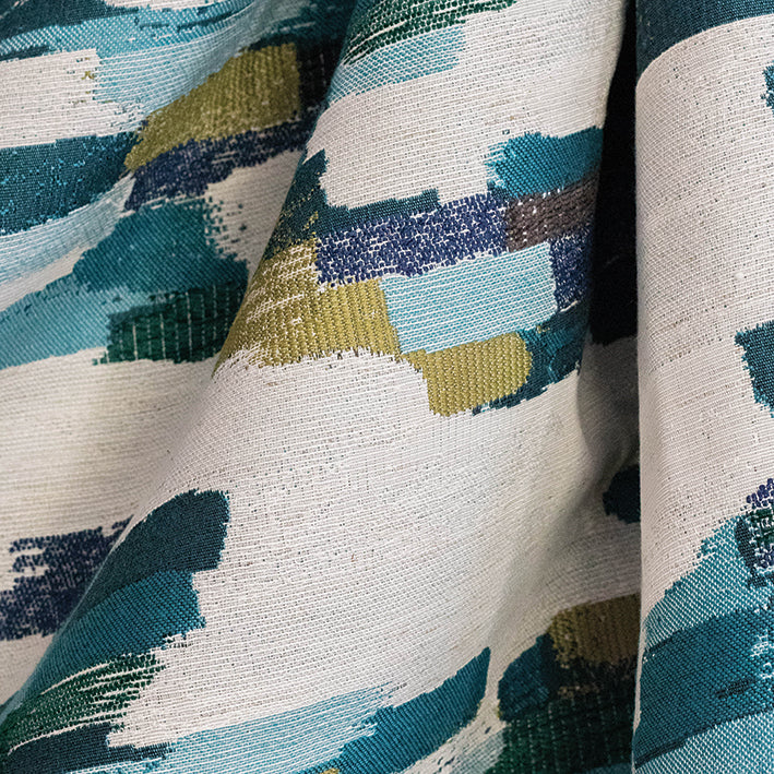 This painterly fabric has tranquil blues and greens overlapping like brush strokes making up an abstract landscape. Ideal for curtains, blinds, cushions, and everyday upholstery.