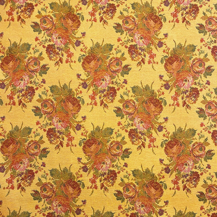 Innamorati Gold is a beautiful vintage style floral jacquard fabric. The stunning soft colours light old gold background make a perfect statement fabric. Perfect for everyday use upholstery and cushions, but also great for heavy curtains.
