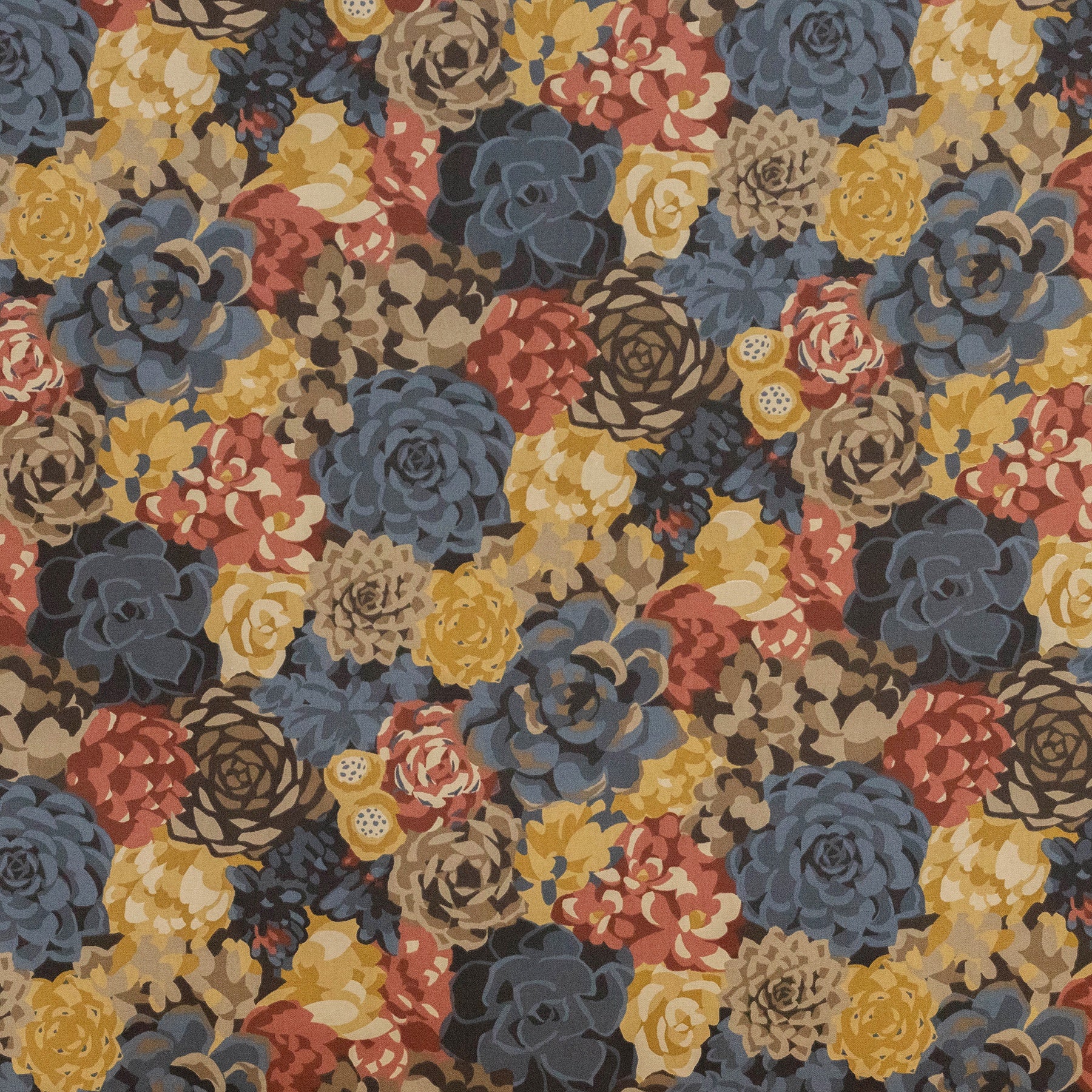 This garden of happy succulents comes in a deep colourway of midnight blue, maroon, chocolate and gold overlapping one another. Fabulous for everyday upholstery, occasional upholstery, curtaining and cushions.