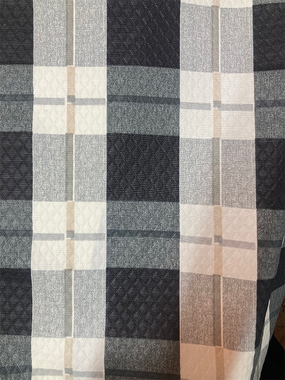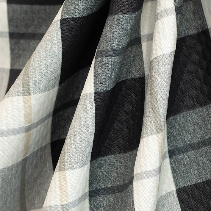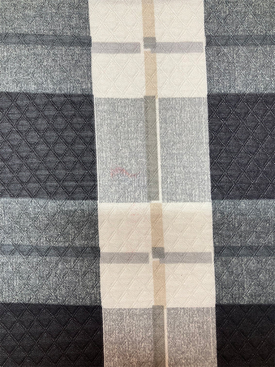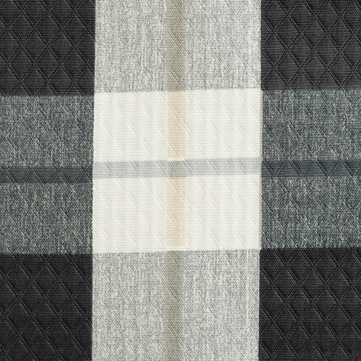 Grey, black and cream squares with grey and nude lines throughout, feature an understated quilted texture over the top. This fabric is water-resistant and is the perfect choice to liven up your outdoor, or indoor, entertaining space, perfect for the patio, poolside, and other home furnishings.