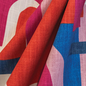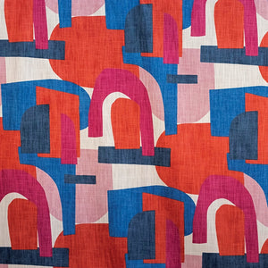 Drift into a dreamland with this bright pop of colour! Candy coloured archways of rose-red, bubblegum pink, fuschia, navy and royal-blue overlay a white background to make up this bold print. Perfect for occasional and everyday use upholstery, cushions and curtaining.