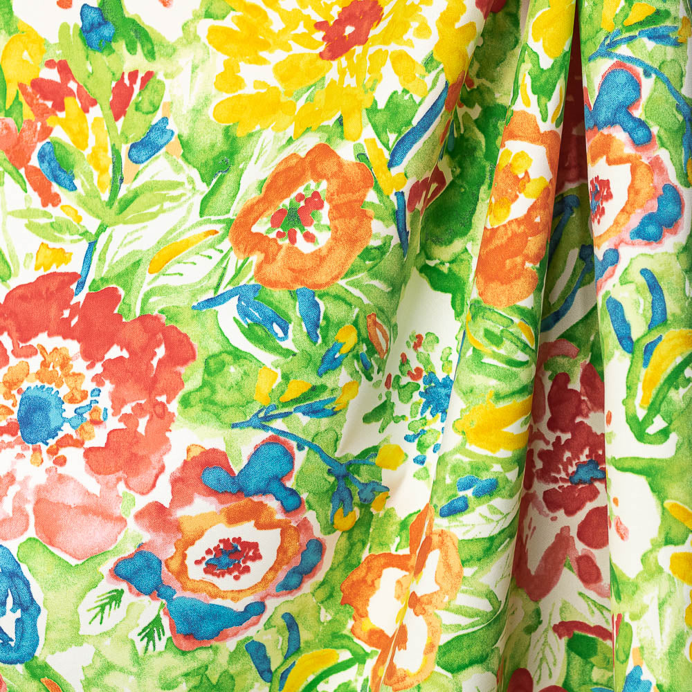 Carlotta is a colourful indoor/ outdoor fabric with a floral watercolor print. This stunning fabric has pops of true green, yellow, orange, red, and light royal blue to create a bright and fun fabric. This fabric is water-resistant and is the perfect choice to liven up your outdoor, or indoor, entertaining space, perfect for the patio, poolside, and other home furnishings.
