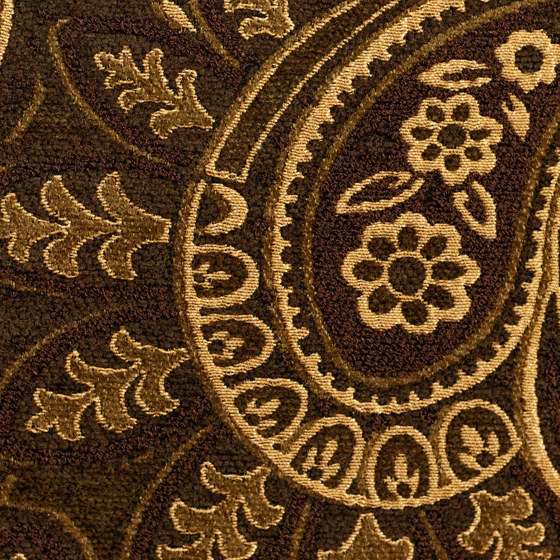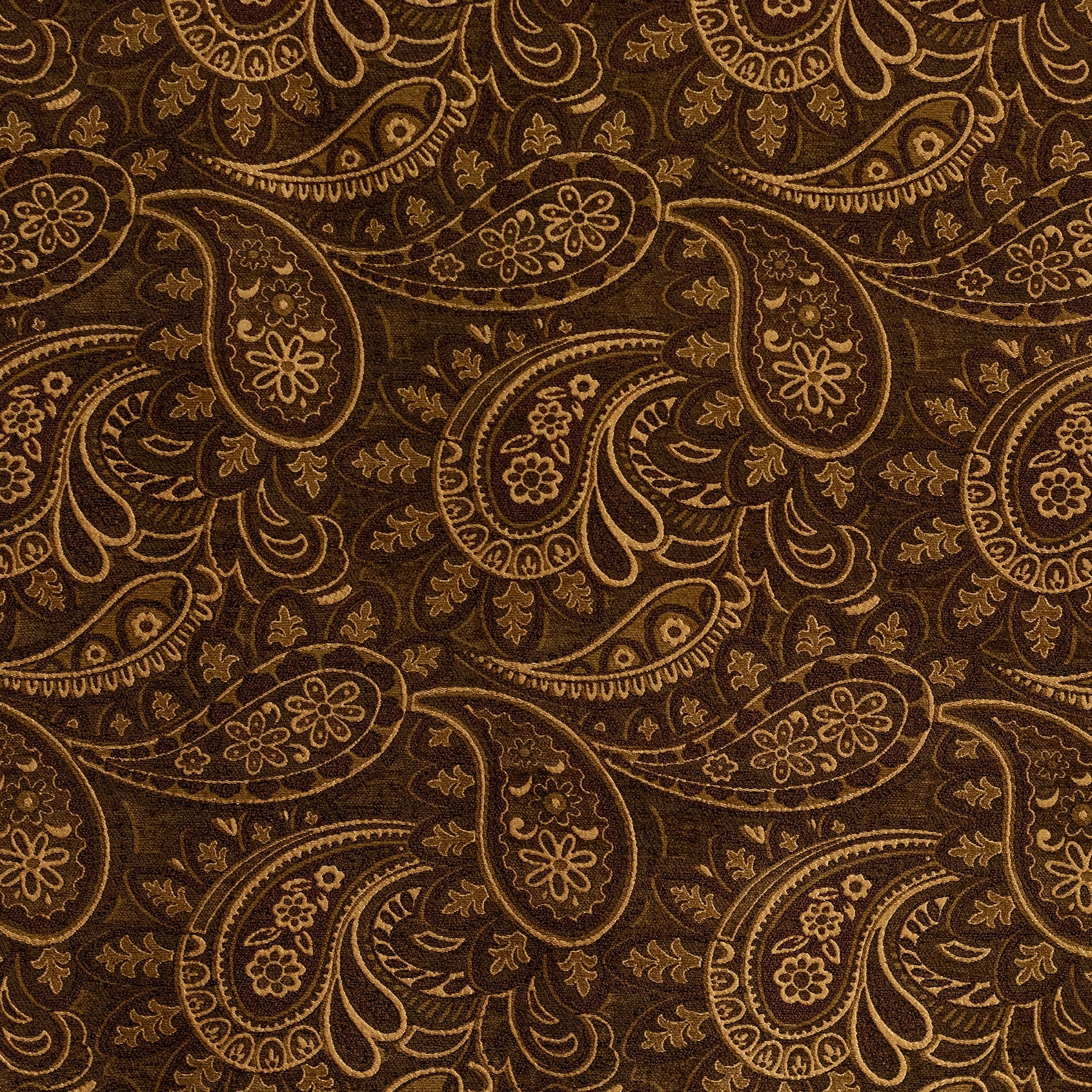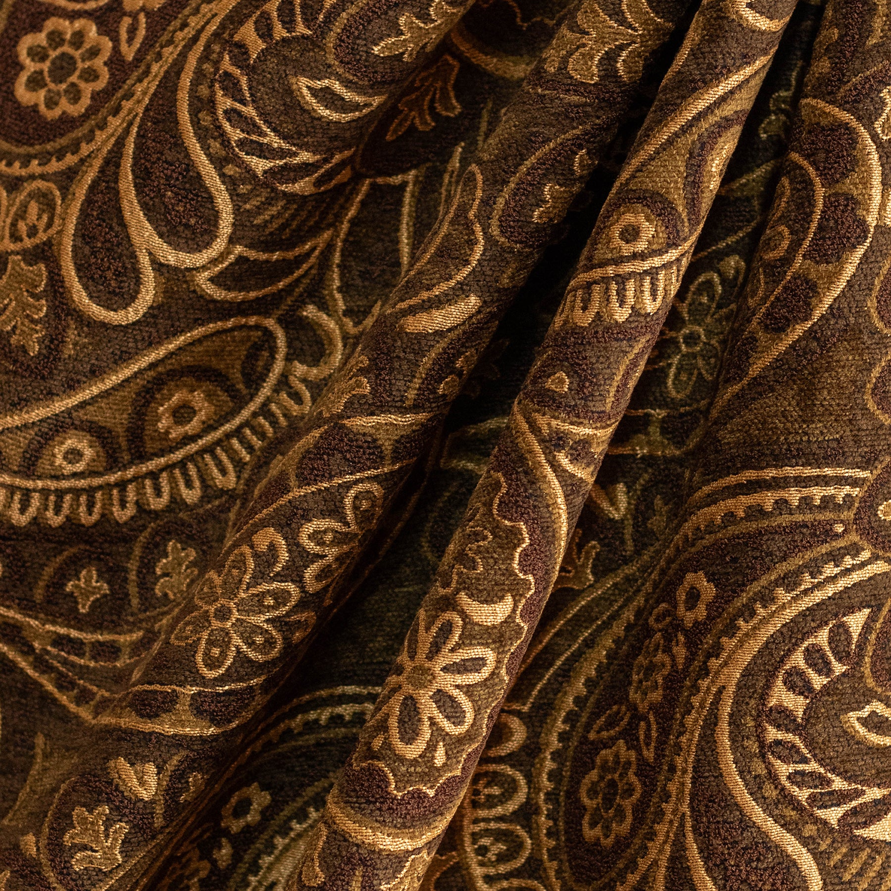 Ember Paisley is richly coloured mocha and gold upholstery fabric with an eye-catching shine.