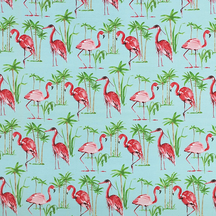 Looking for something that stands out? This cheerful kitschy outdoor print has brilliant pink flamingoes and swaying green palm trees dotted over a turquoise blue background. Flamenco is water-resistant and the perfect choice to liven up your outdoor, or indoor, entertaining space, perfect for the patio, poolside, and other home furnishings.