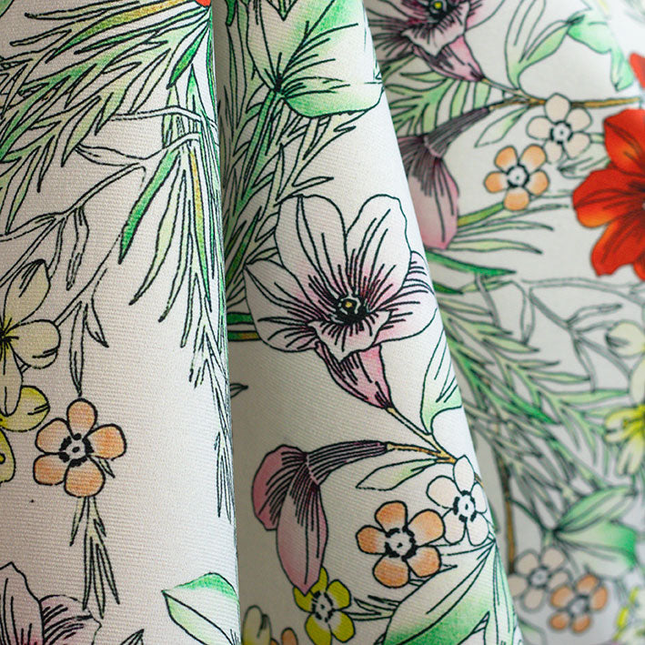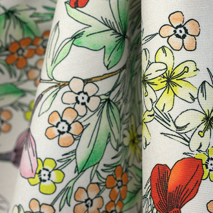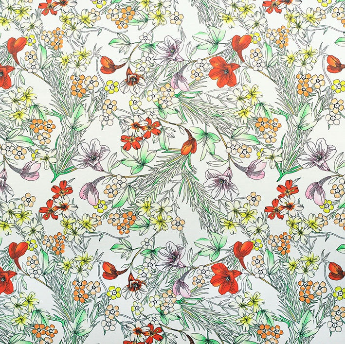 Floriography is a beautiful, watercolour, colouring book-inspired printed velvet. Featuring vibrant pops of colour on a white velvet base cloth, this fabric is perfect for everyday upholstery, curtaining, cushions and lampshades.