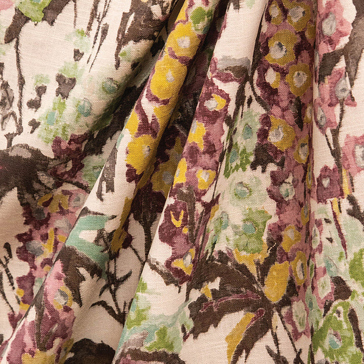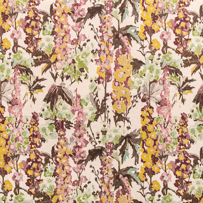 Hollyhocks Burgandy is a stunning hollyhock flower design, in beautiful shades of burgundy, with mustard and mint accents. Perfect for curtains, cushions and occasional use upholstery.