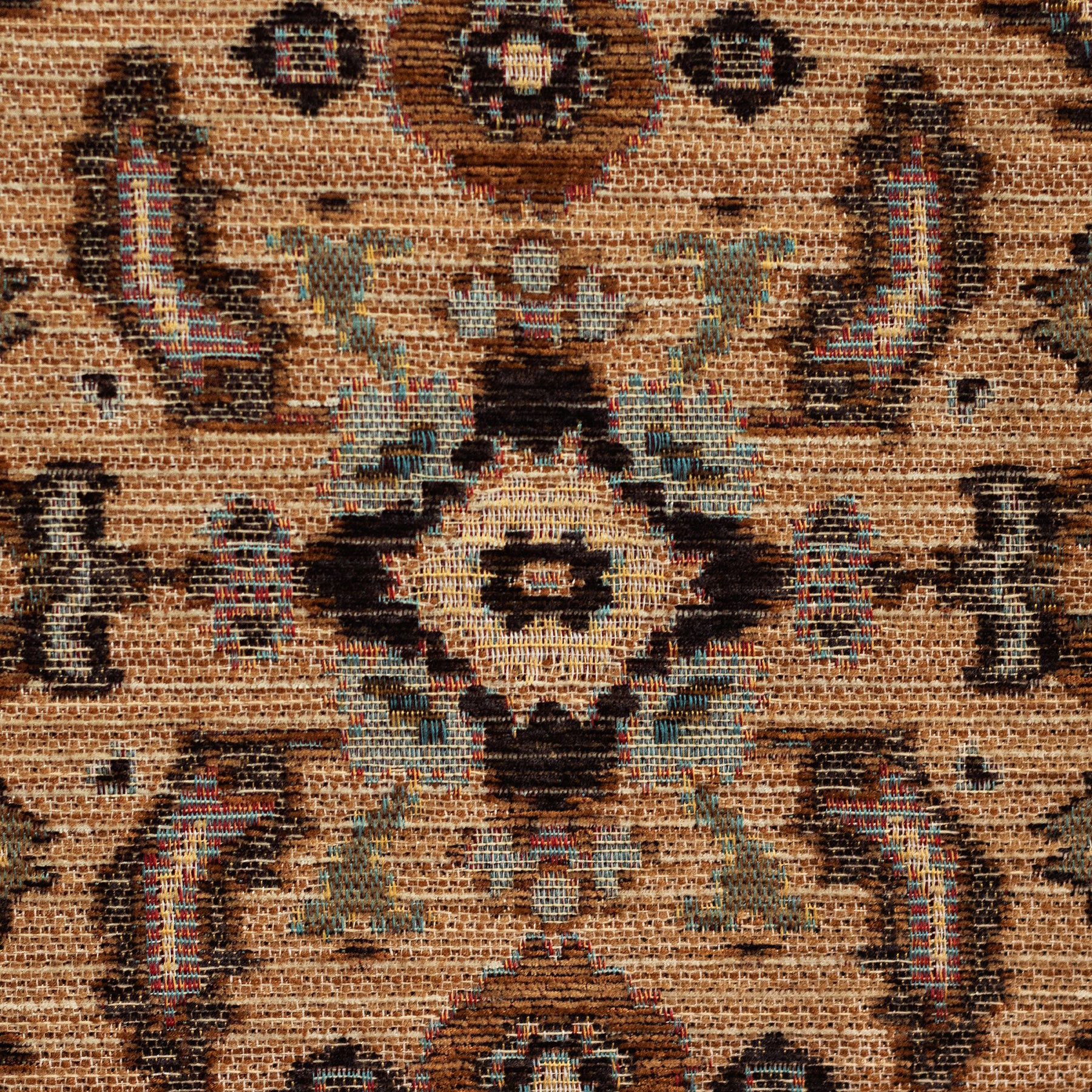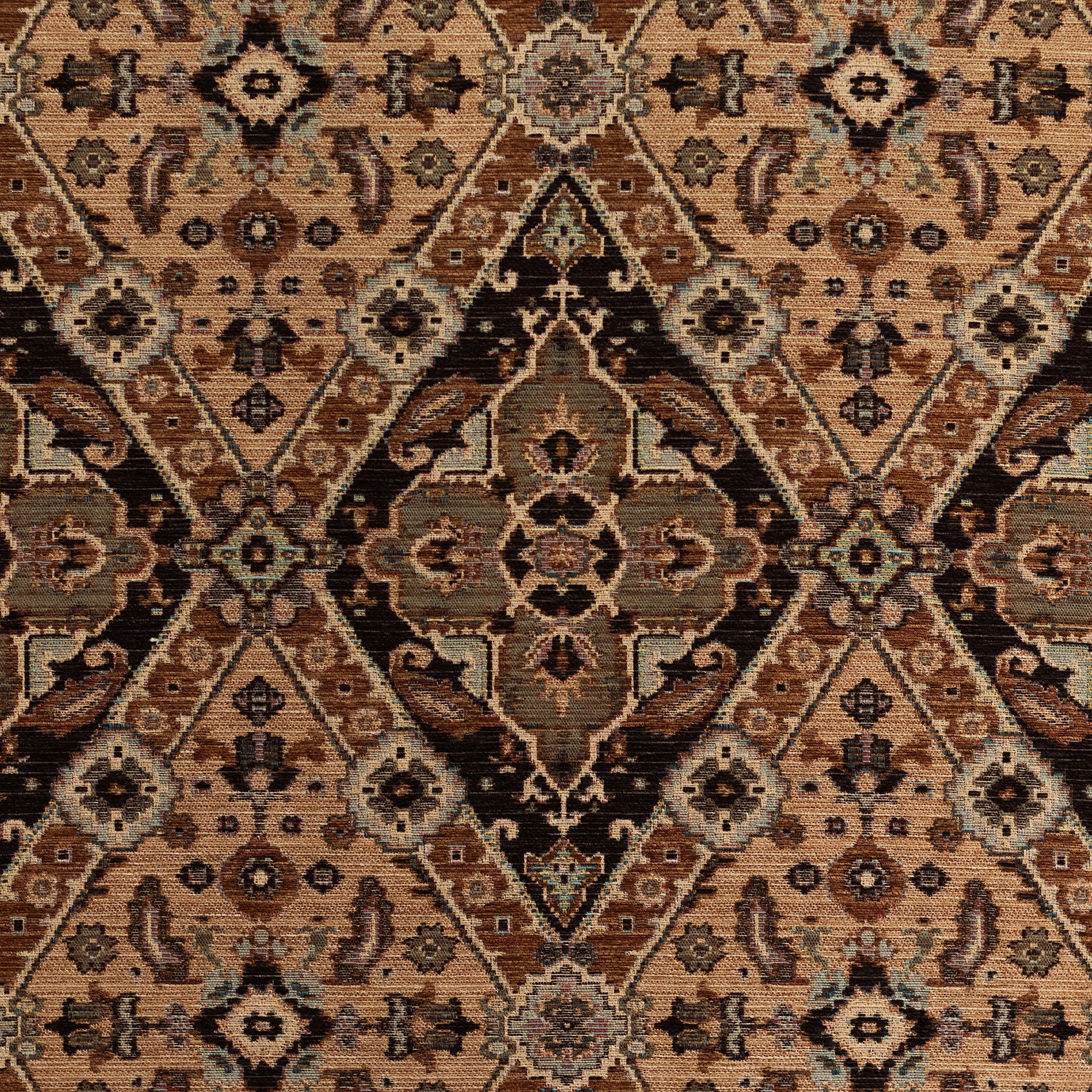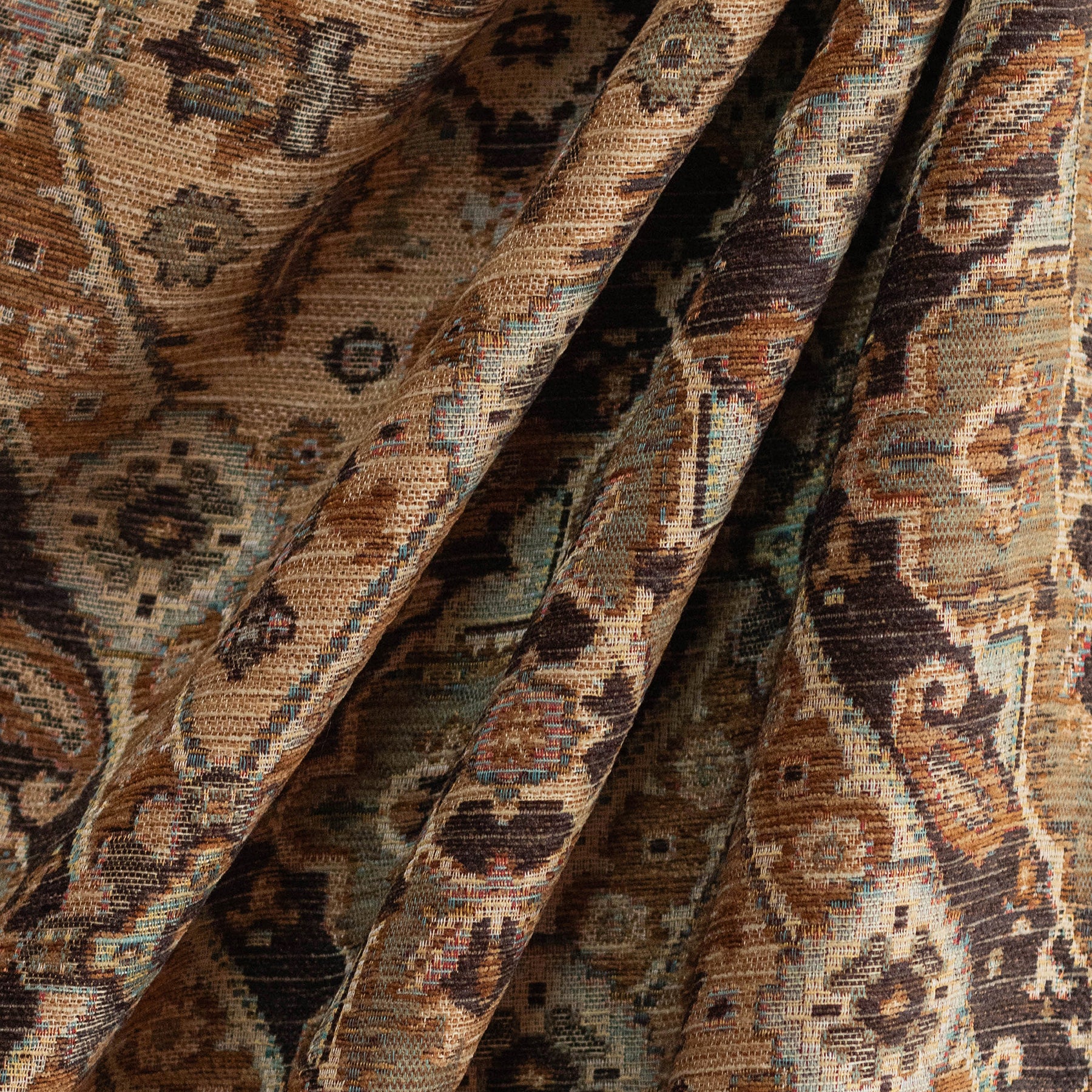 Chocolate brown and beige with pops of baby blue, this fabric has a warm and earthy richness to it.