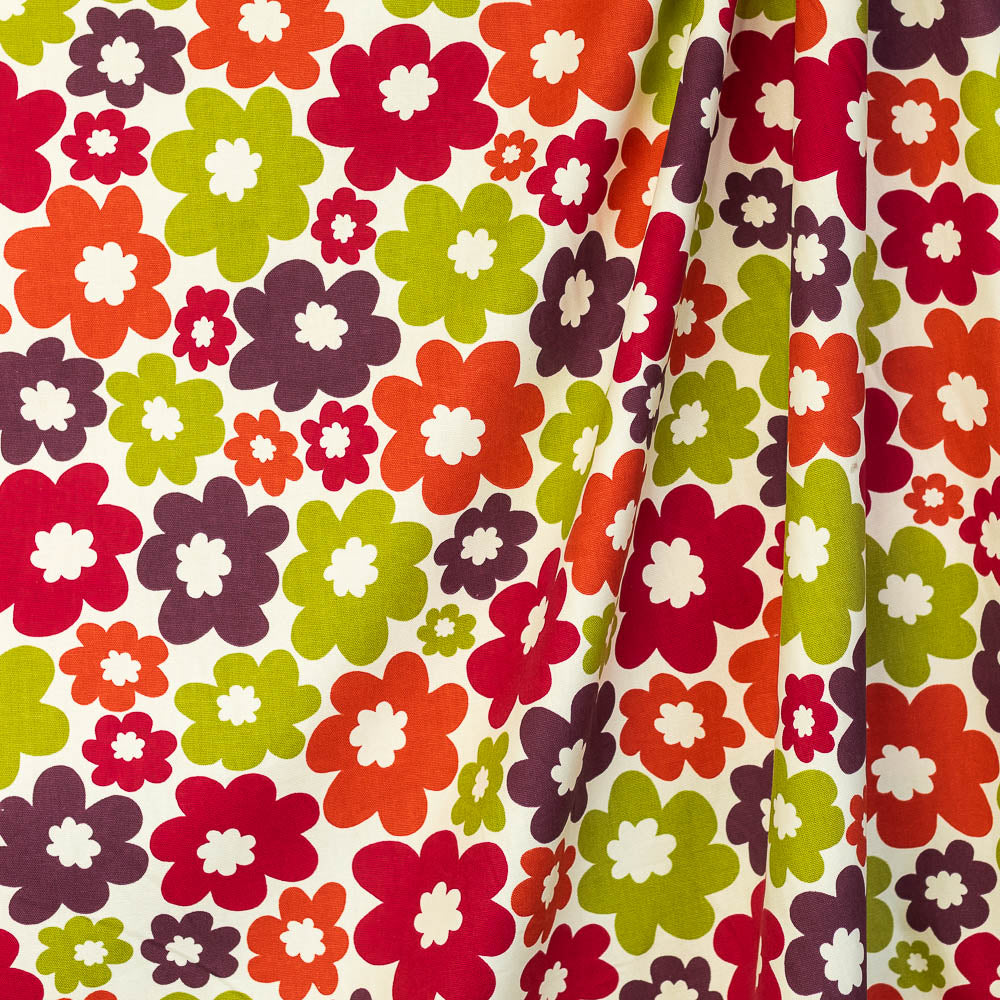 Lizzie is a fun and colourful retro fabric featuring playful graphic flowers in lime green, dark mauve, berry red/ pink, and orange against an off-white background. This fabric is suitable for curtaining, blinds, cushions, and occasional upholstery.