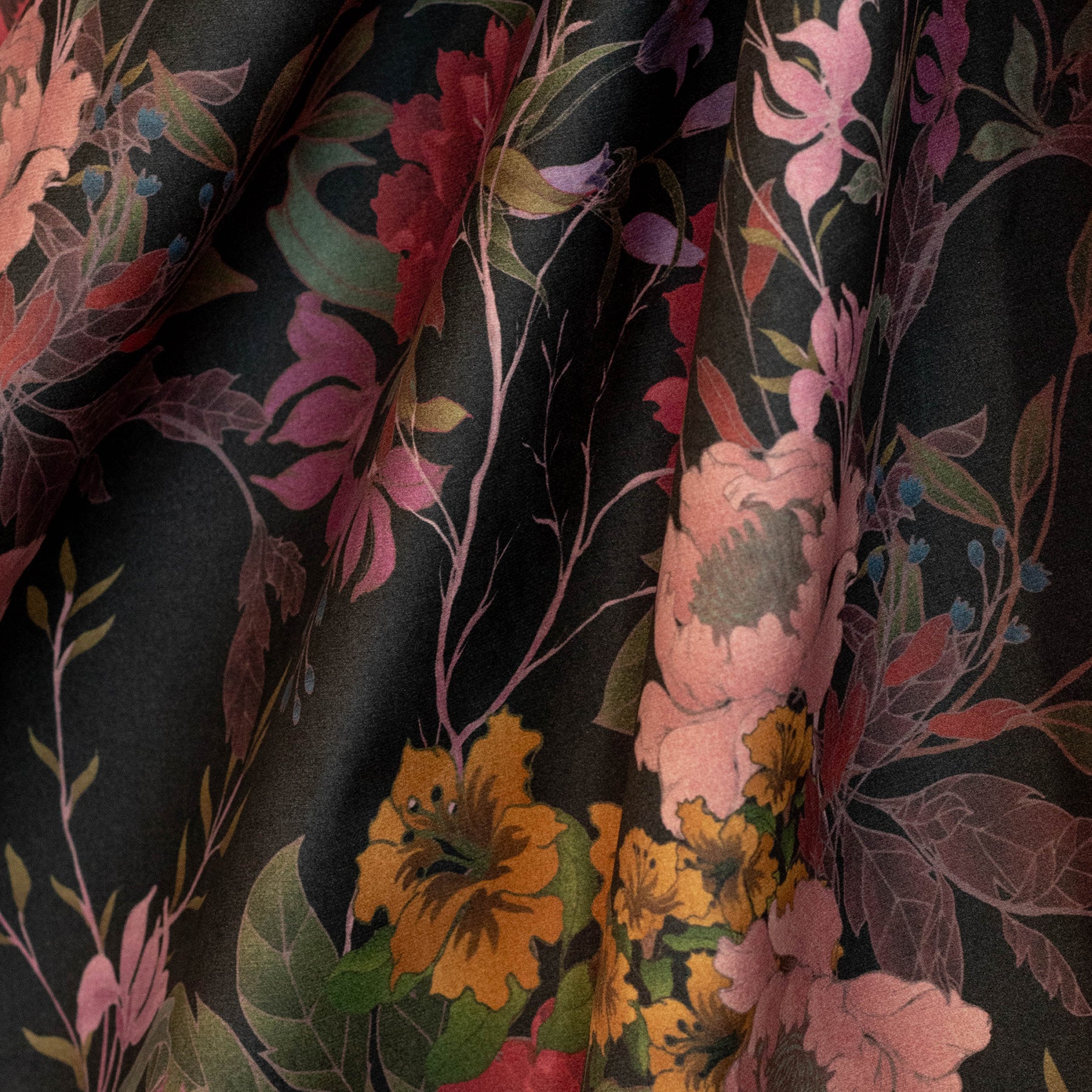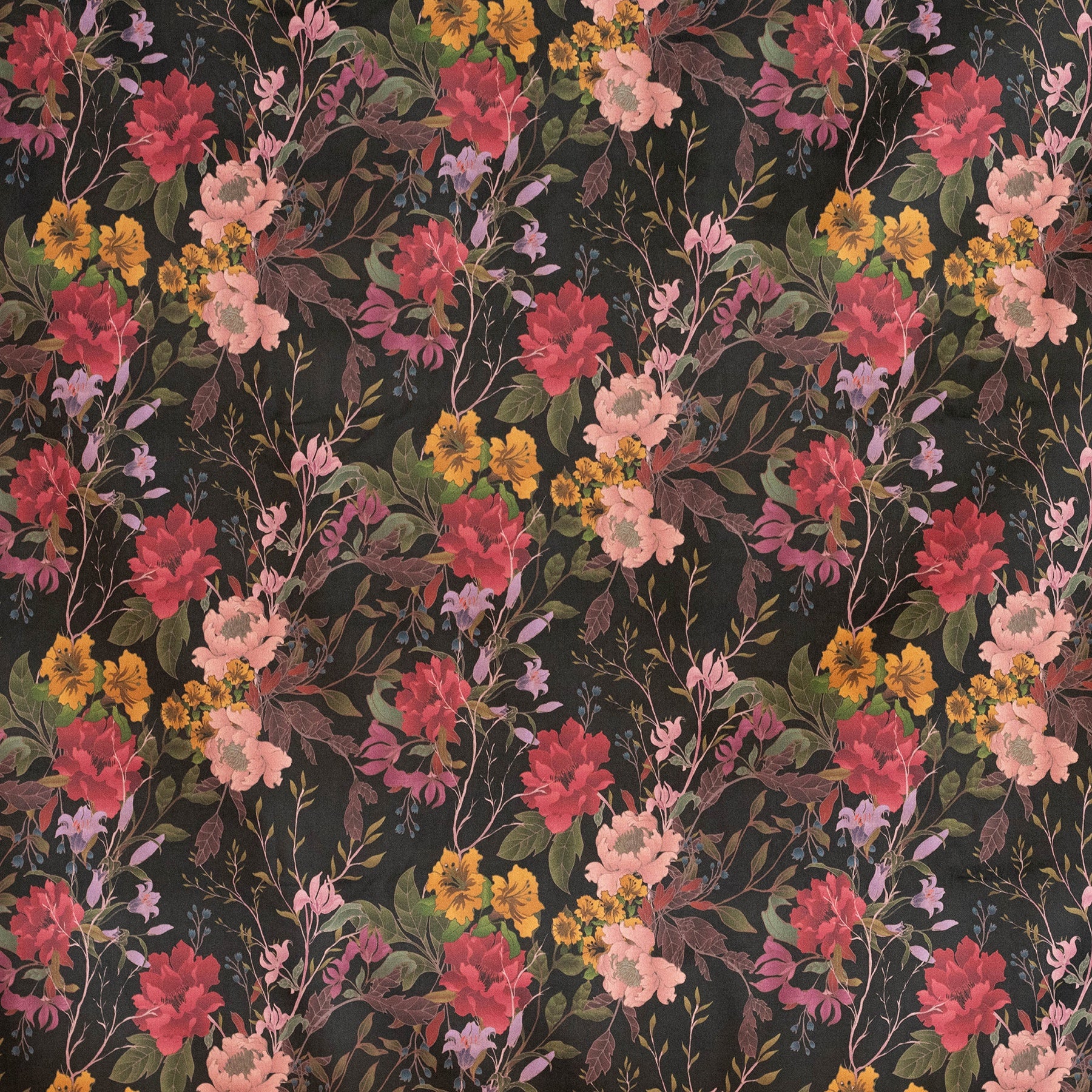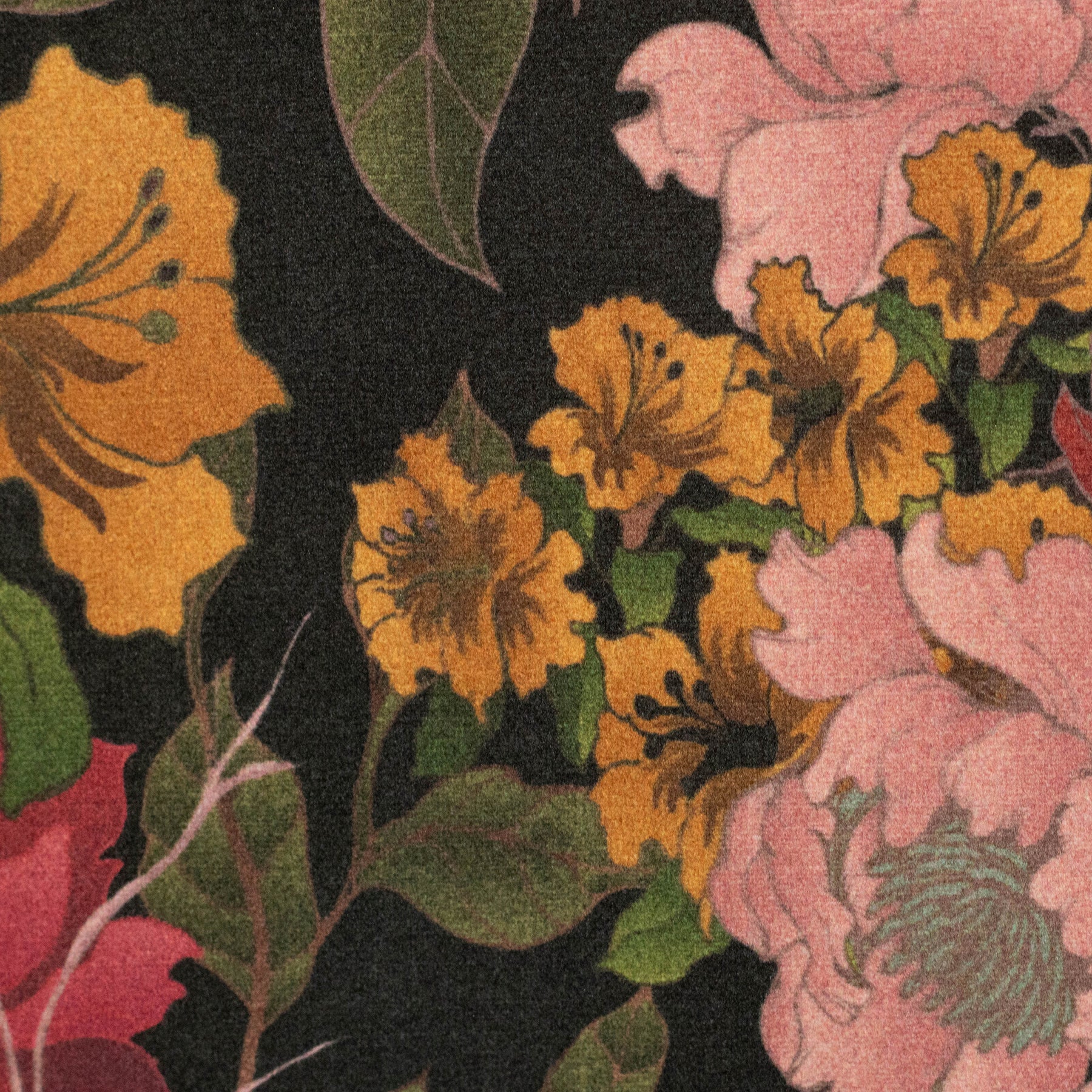 This captivating floral velvet has an ornate bouquet of pastel pink, ruby and gold flowers over a contrasted black background.