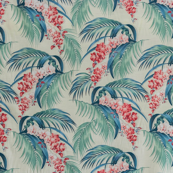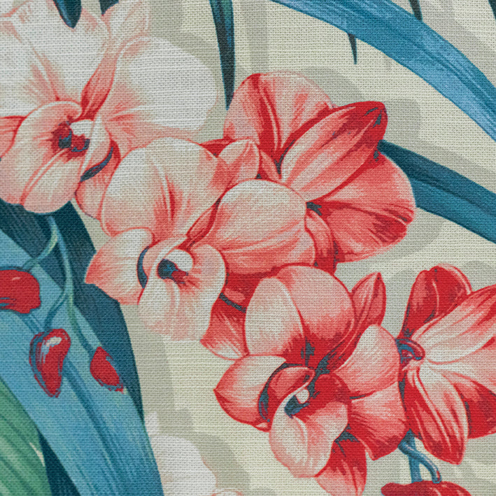 Beautiful ornate pink and white orchids cascade over shiny blue and aqua fronds against a light grey background. A gorgeous option for occasional and everyday use upholstery, cushions and curtaining.