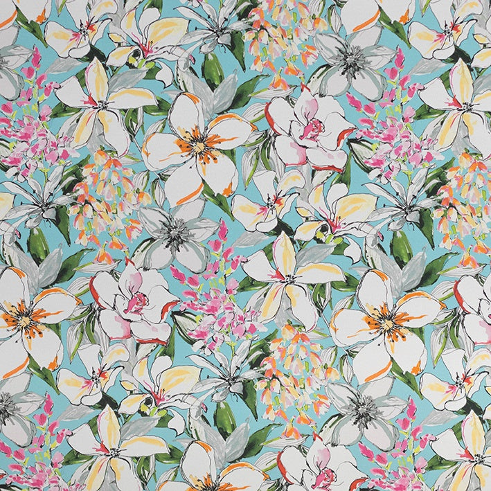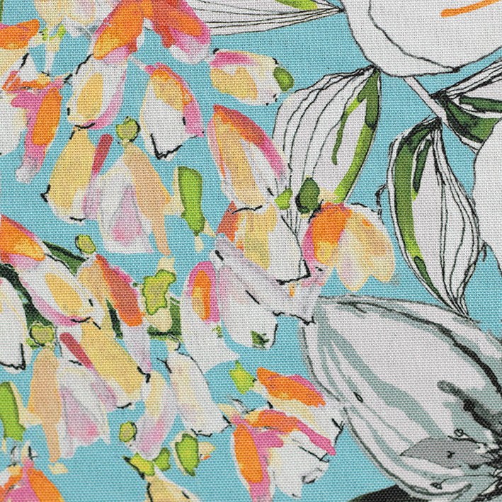 Painterly white florals with pops of peach and pink over a powder blue background in this water-colour-esque outdoor print. Summery and fresh, this fabric is water-resistant and is the perfect choice to liven up your outdoor, or indoor, entertaining space, perfect for the patio, poolside, and other home furnishings.