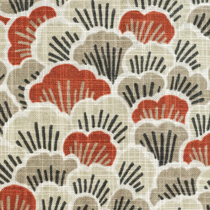 This delicate floral Japanese-style print has a multitude of overlapping petals in beige, red and grey over and off-white background.