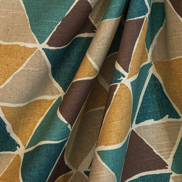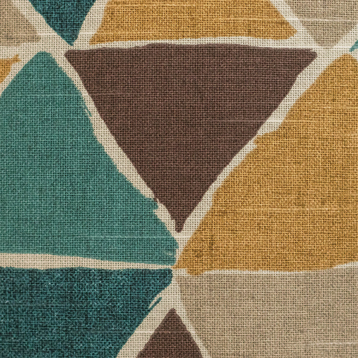 Pyramids is a playful multi-coloured geometric cotton fabric with triangles of aqua, teal, brown, taupe and ochre. Perfect for occasional and everyday use upholstery, cushions and curtaining.