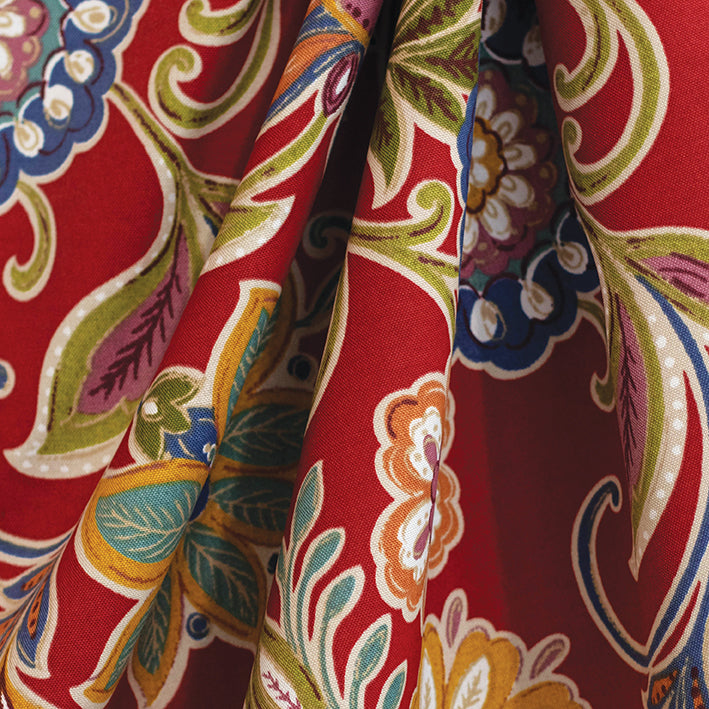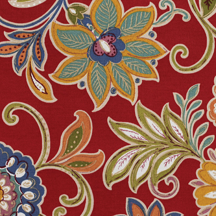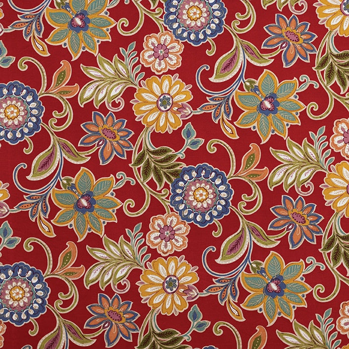 Rustic and playful! Summery flowers of blue, yellow, orange and pink swirl over a ruby red background. This fabric is water-resistant and is the perfect choice to liven up your outdoor, or indoor, entertaining space, perfect for the patio, poolside, and other home furnishings.
