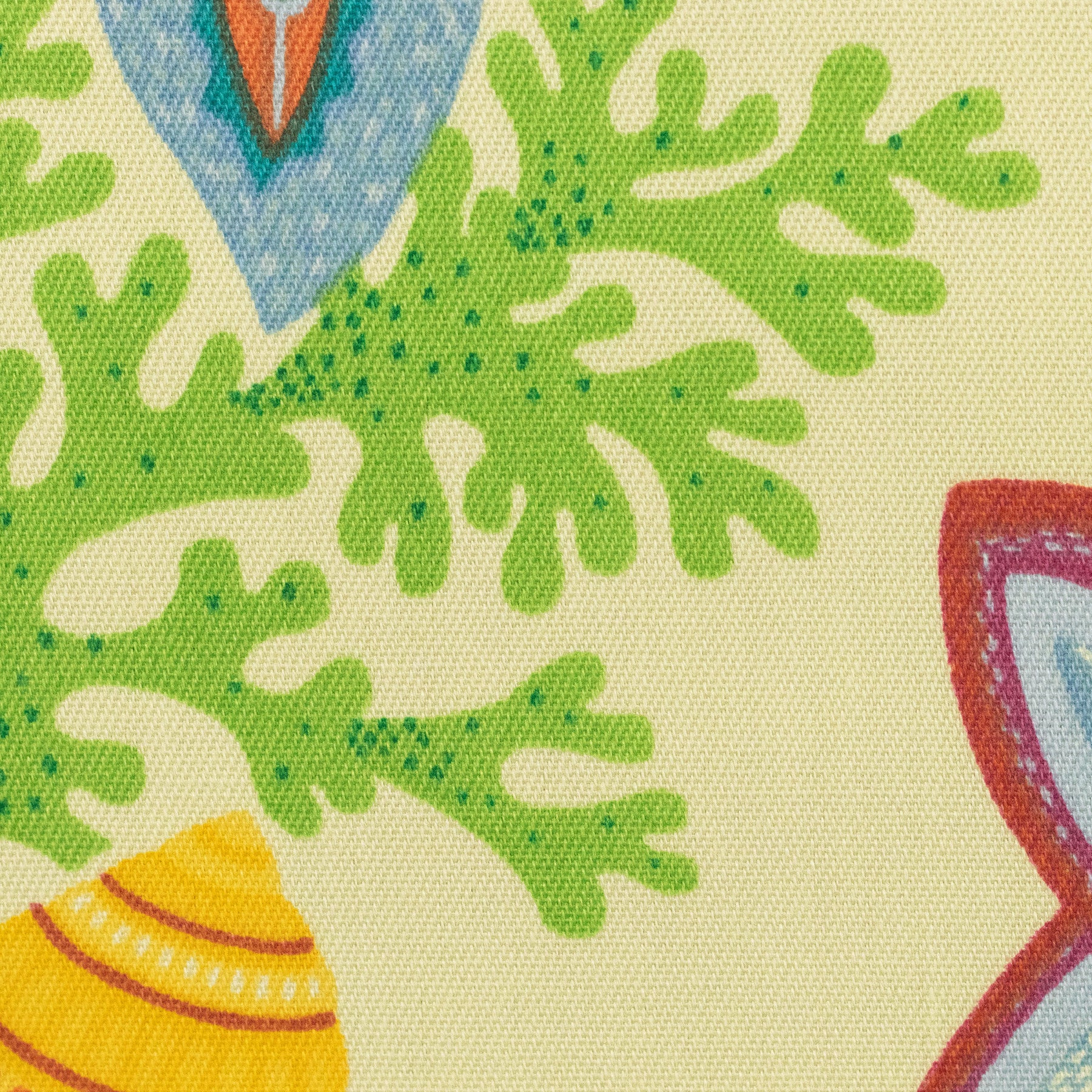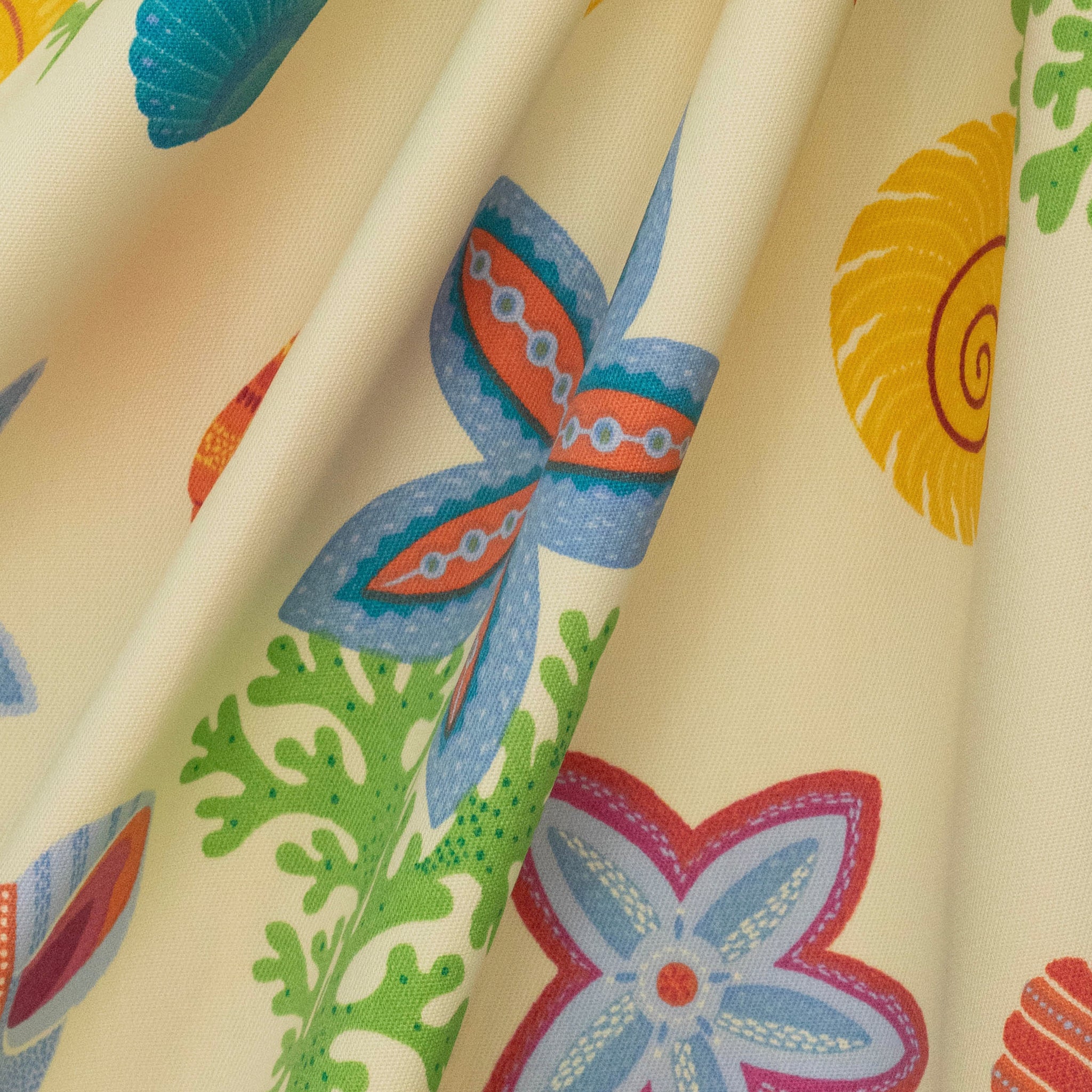 Take a walk along the shoreline with this colourful outdoor fabric where playful shells and seaweed lay scattered about a sandy seafloor. Perfect for everyday upholstery, occasional upholstery, outdoor, curtaining and cushions.