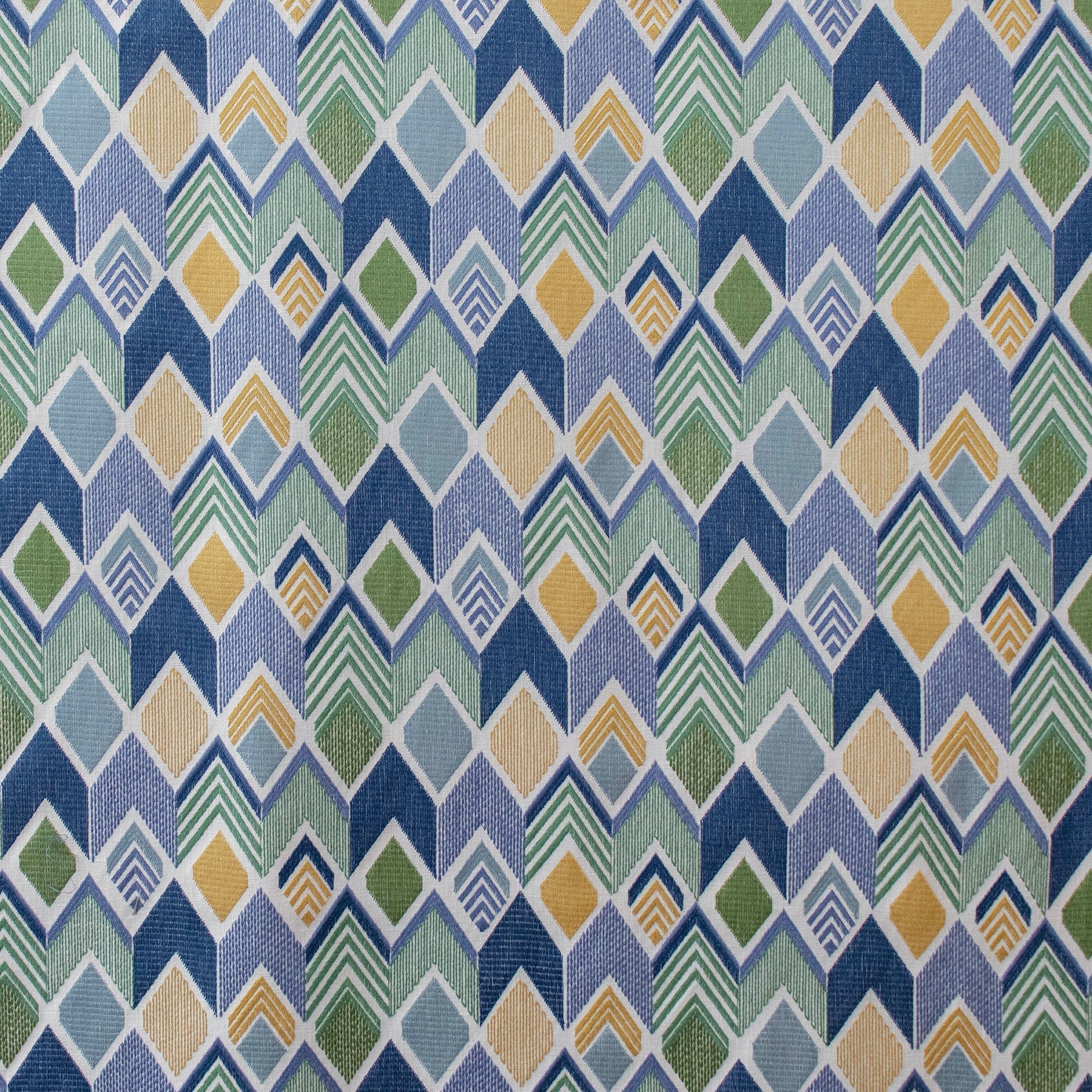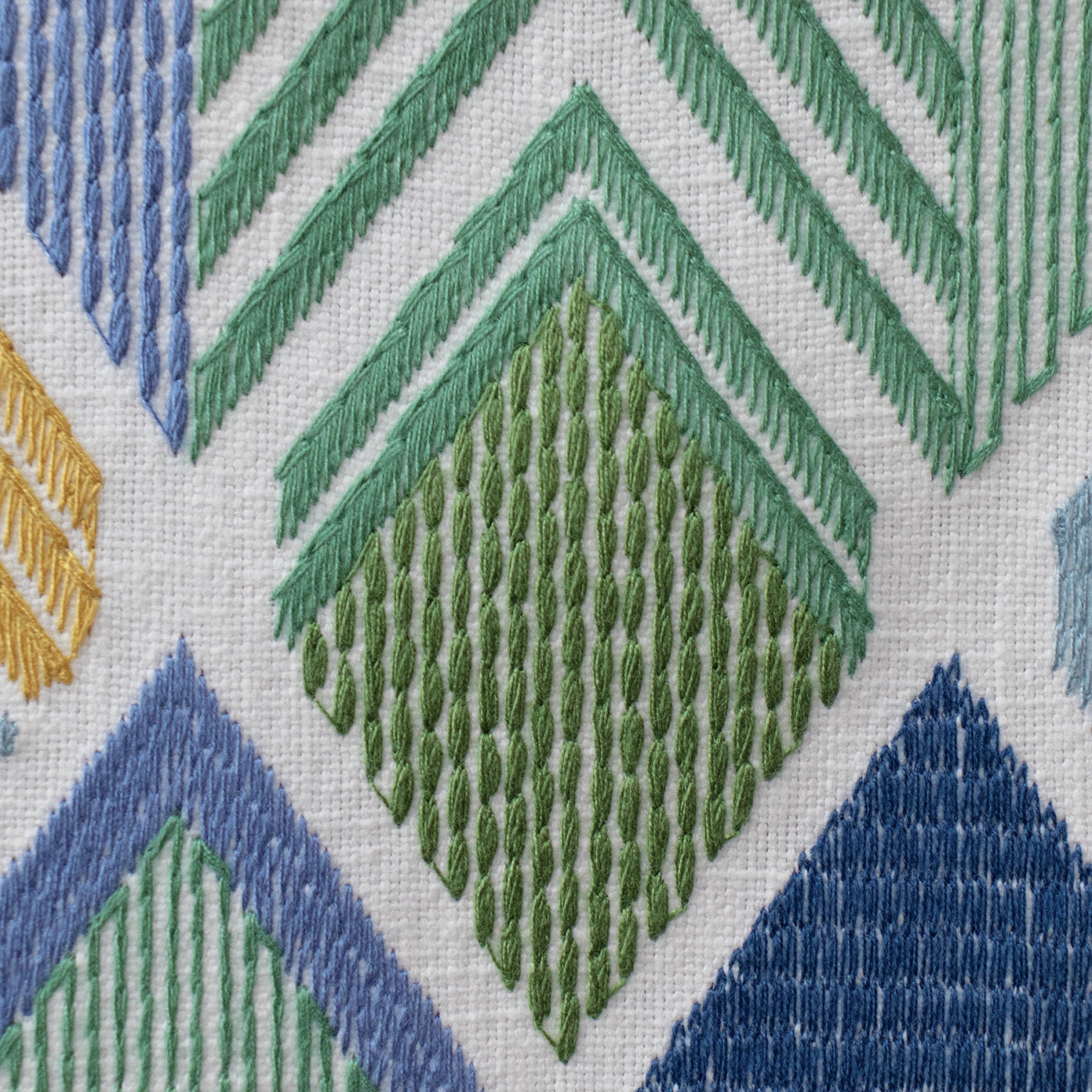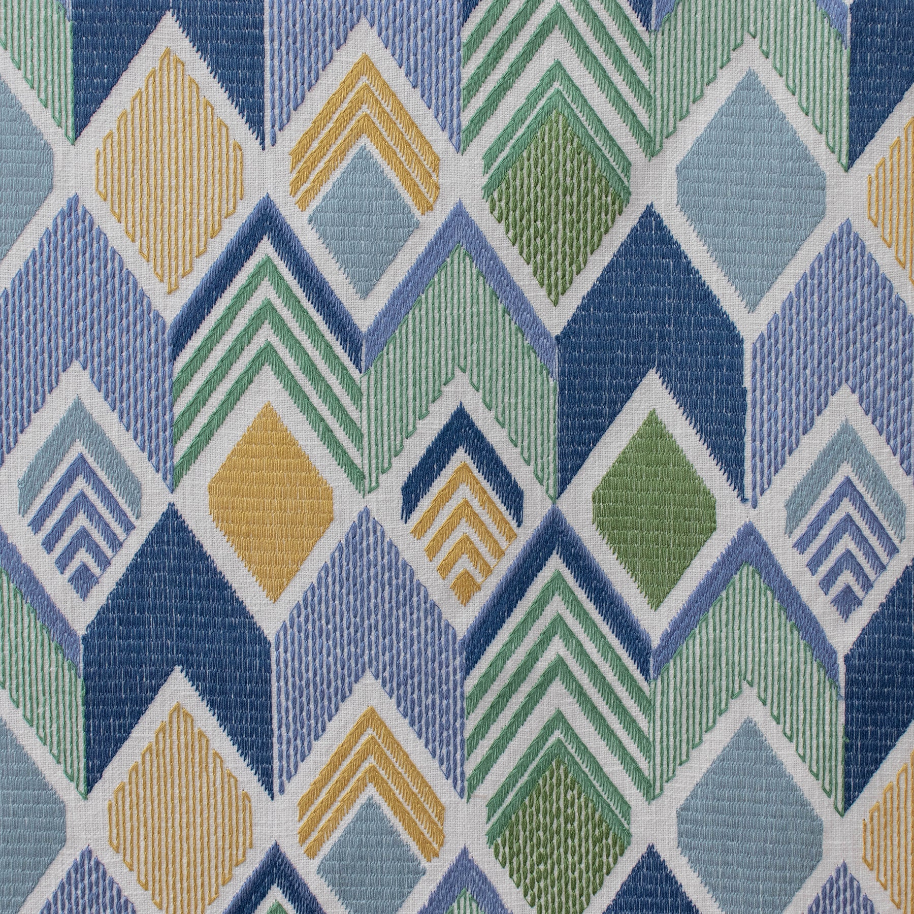 Solitaire Calypso is a vibrant geometric design that brings colour, movement, and texture to your interiors. Featuring stitched angular shapes in soft blues, fresh greens, and warm golden tones on a natural white base. This playful embroidery feels both bold and balanced. Perfect for statement cushions, feature curtains, or occasional upholstery, Solitaire Calypso adds personality without overpowering a space.