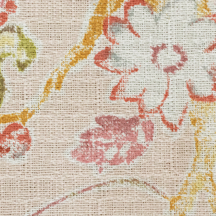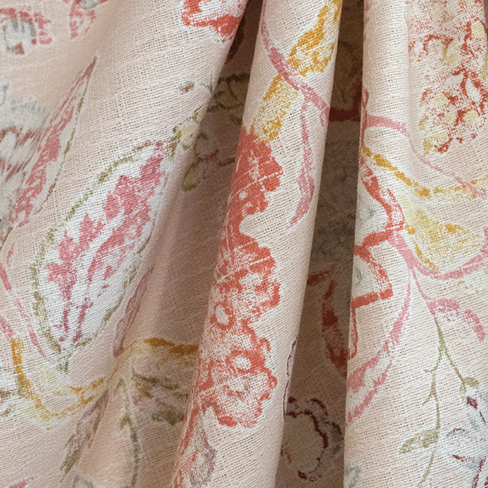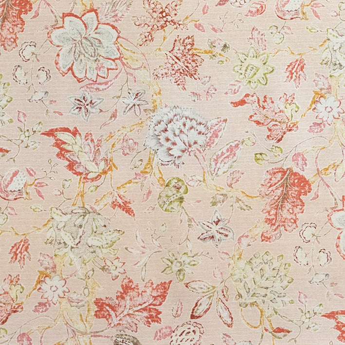 Soft pastel florals overlay a blush-coloured background with a washed-out vintage effect throughout, creating a subdued bohemian look. You can use this material for cushions, curtaining and occasional upholstery.