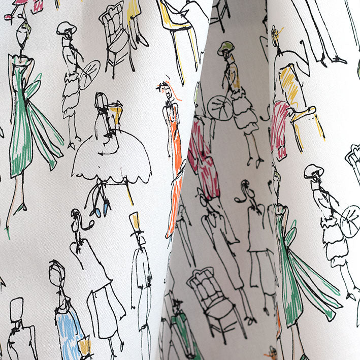 Times Square is a playful doodle-style print, depicting a crowd of people. Featuring pops of colour on a bright white cotton base cloth - it is perfect for curtains, occasional upholstery, cushions, and more!