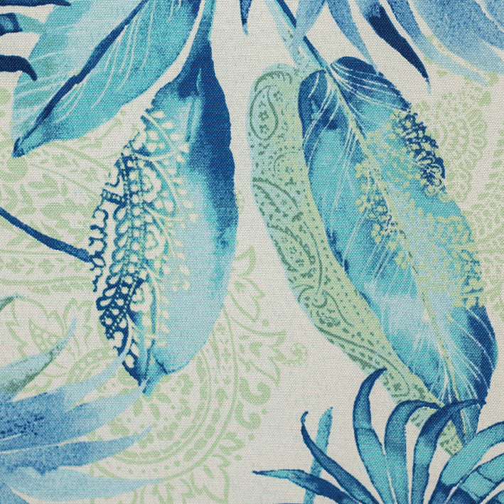 Turquoise blue palm fronds float over a white background with pale green paisley motifs over the top. This fabric is water-resistant and is the perfect choice to liven up your outdoor, or indoor, entertaining space, perfect for the patio, poolside, and other home furnishings.