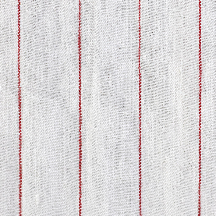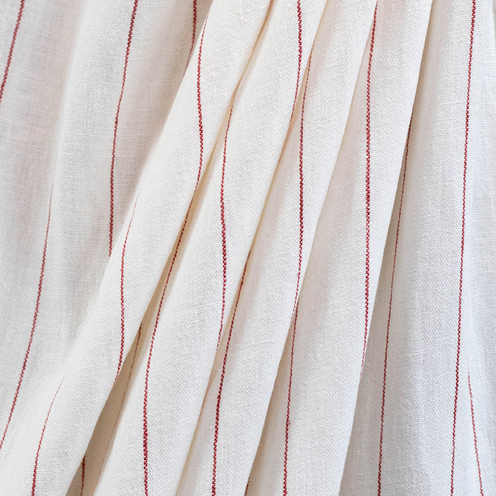 Vis Linen Red is a wonderfully classic white linen featuring thin red stripes. This midweight fabric would hang as beautiful subtly patterned curtaining, cushions or even use on your occasional upholstery projects. Also suitable for other home furnishings such as napkins, tablecloths, and tea towels.