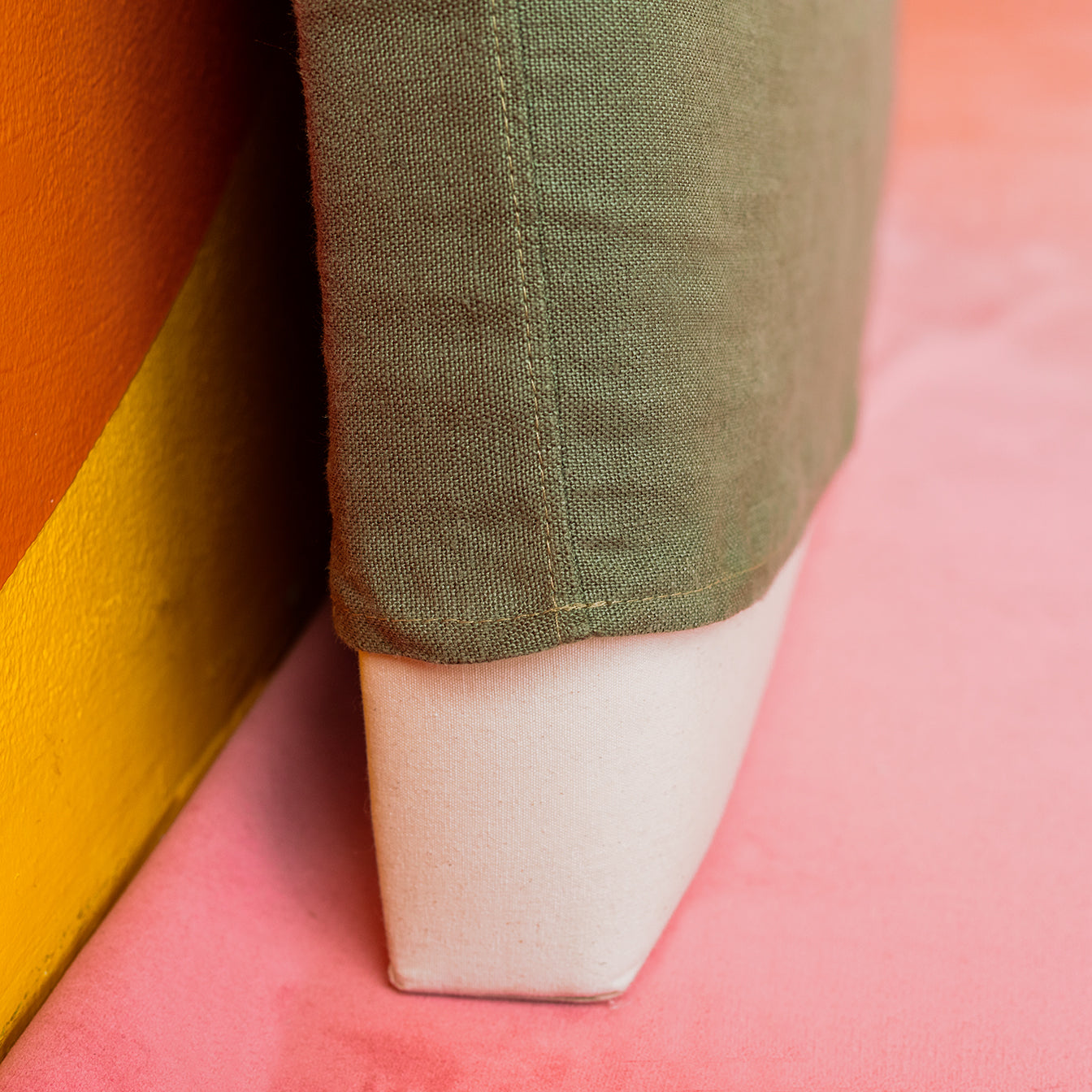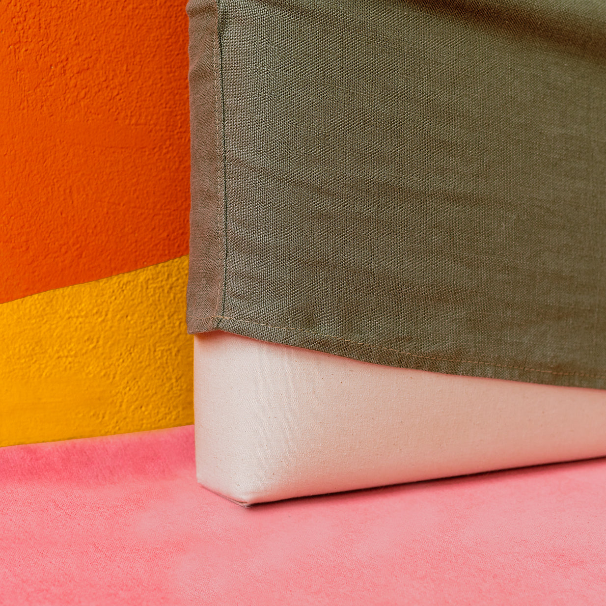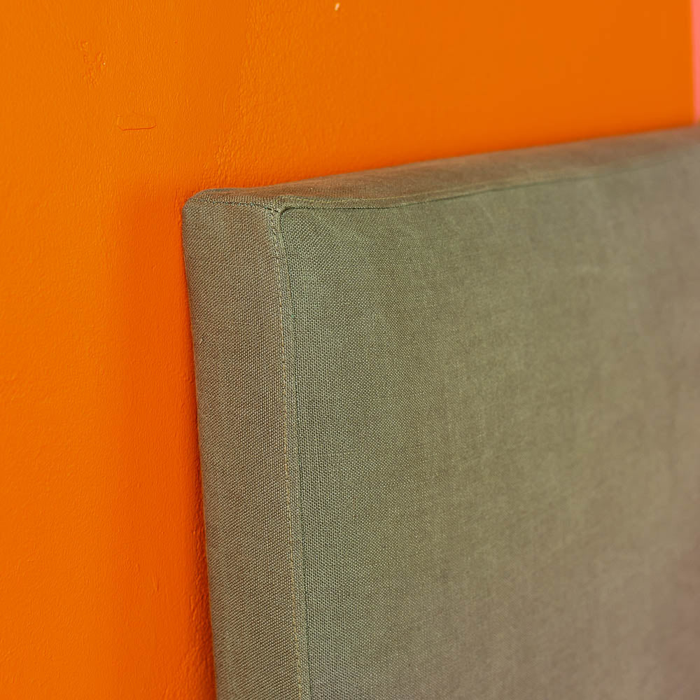 Beautiful moss green headboard with removable, washable linen loose cover.