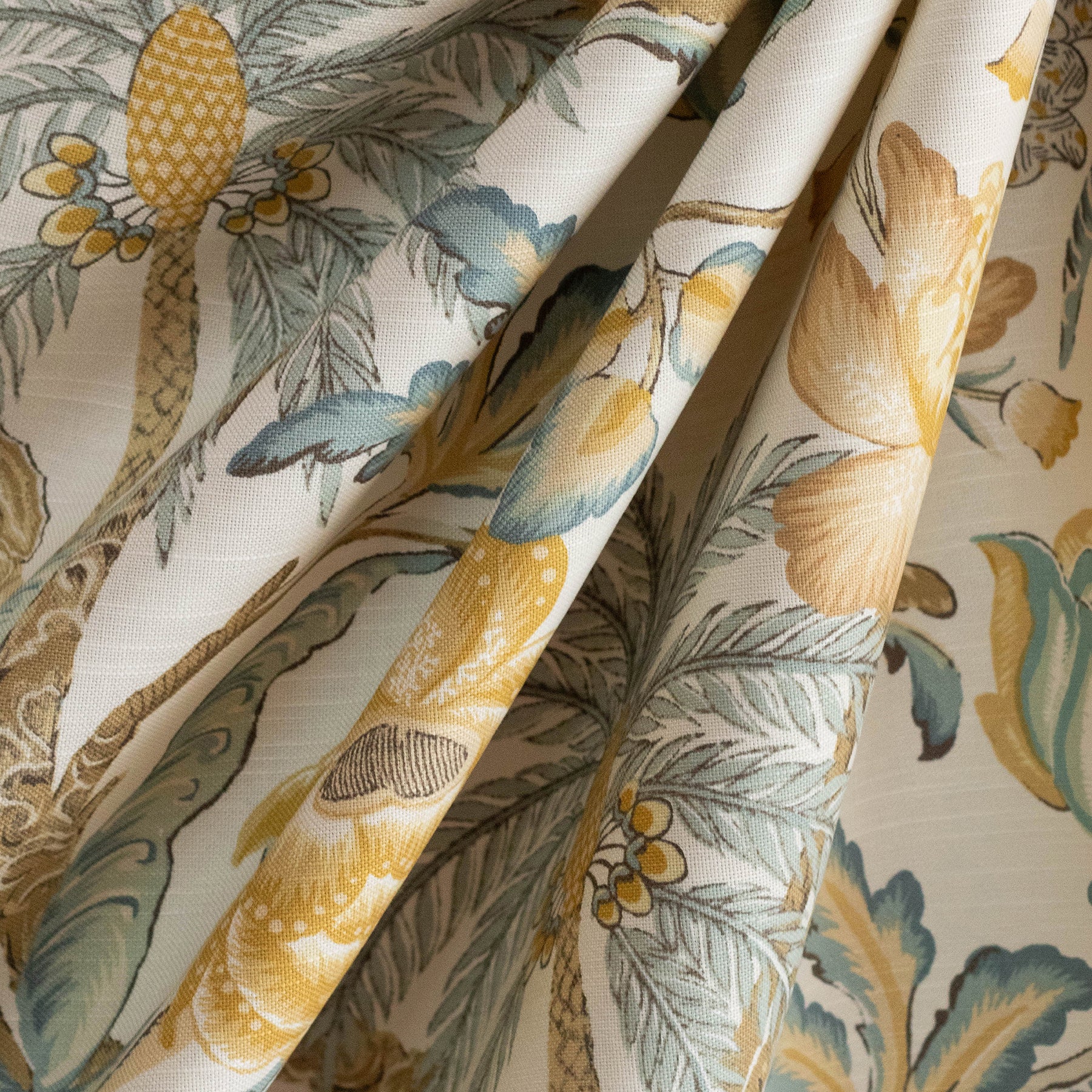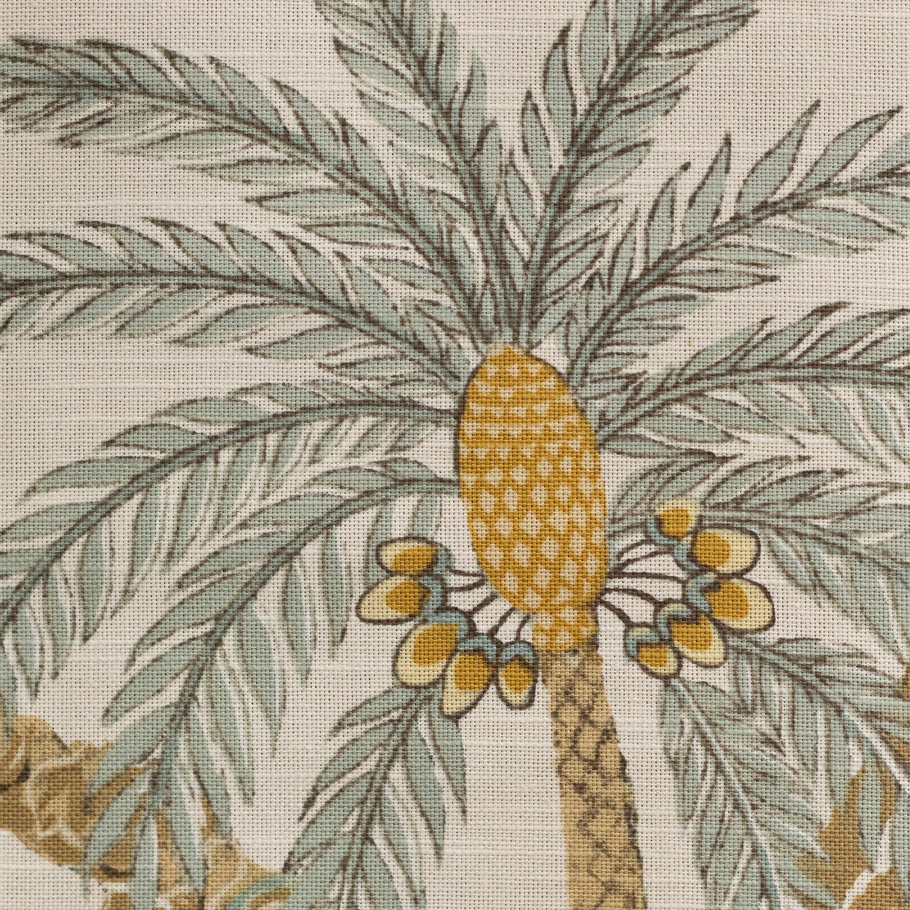 Madagascar Multi is a playful jungle print with whimiscal flora and palm trees in faded golds, brown and mustard with mint foliage over a cream basecloth.