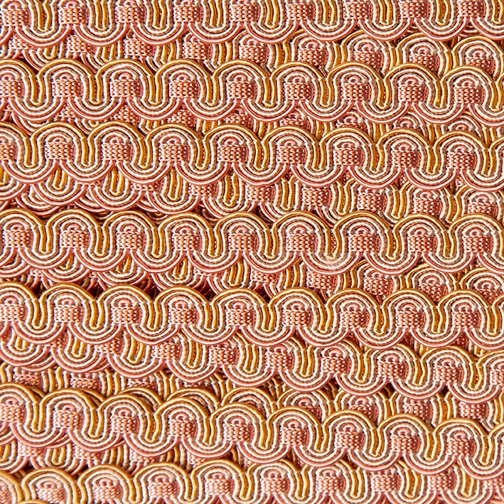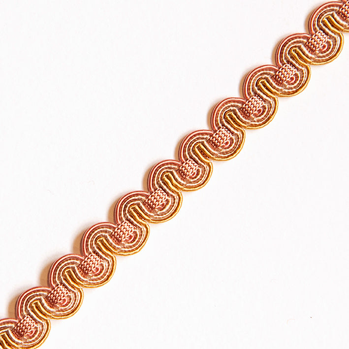 A dusty rose and gold combination make up this gorgeous trim, perfect for cushions, crafts and decorating.