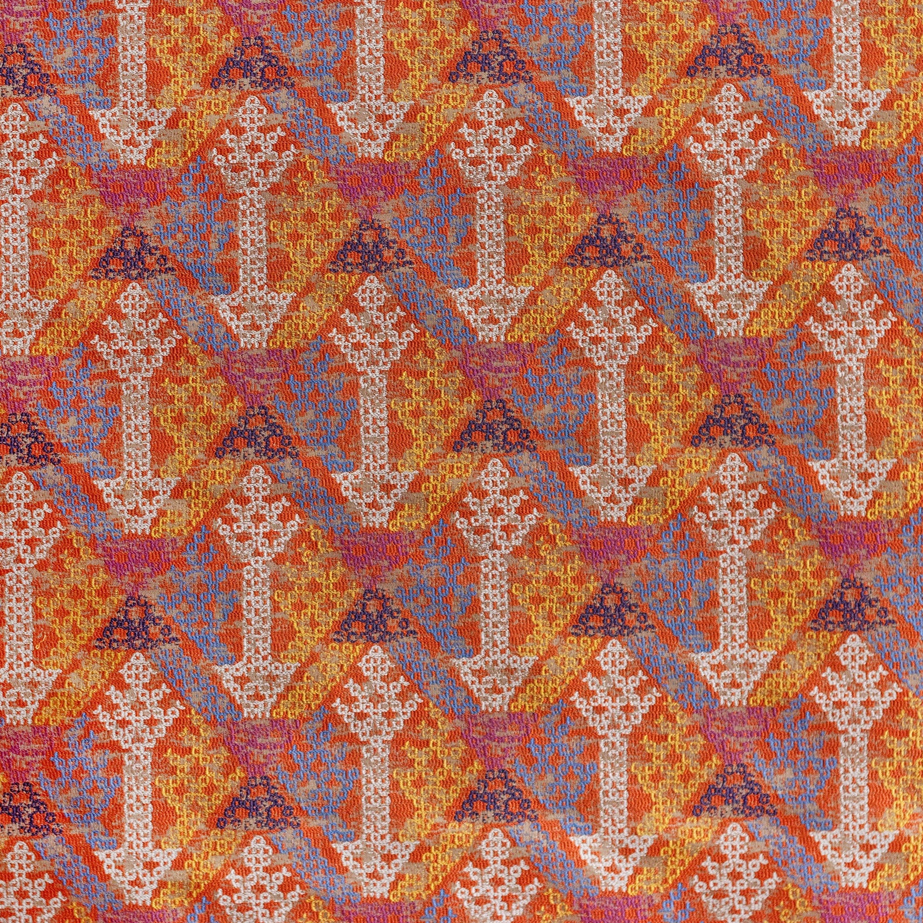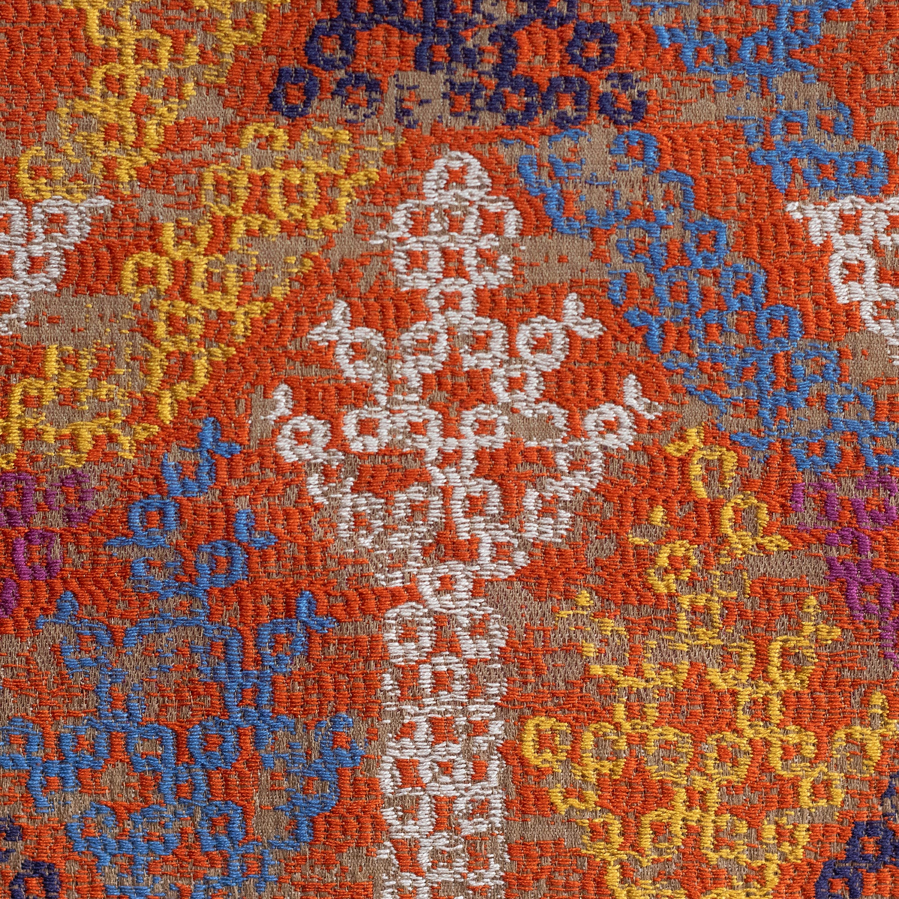 This bright and bold fabric is packed with colour - a taupe coloured background brings to life a burst of orange featuring little motifs in white, sky blue, canary yellow, purple and navy.