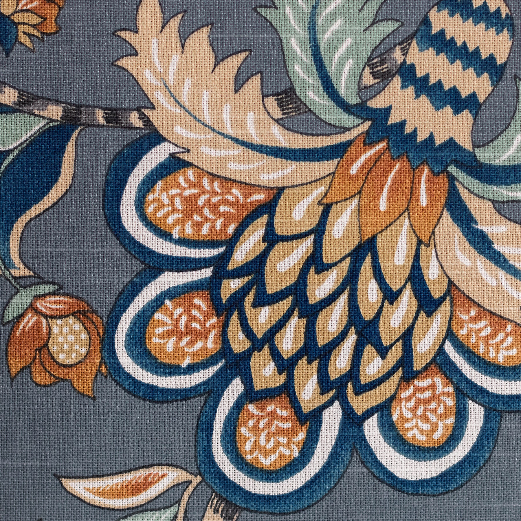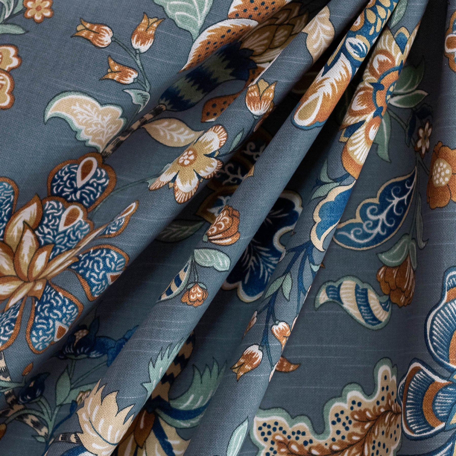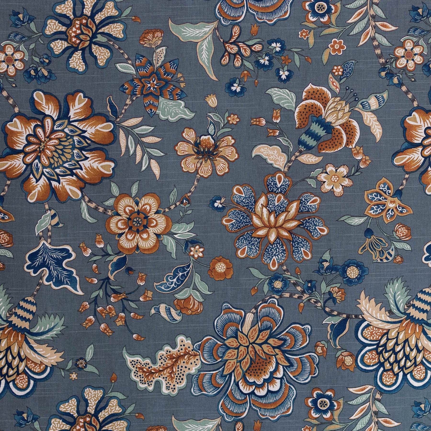 Rich hazelnut, navy and mint coloured-flowers burst to life over a denim blue background.