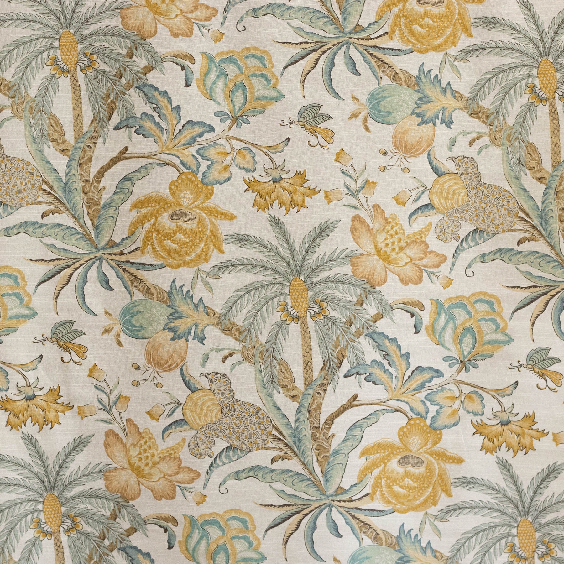 Madagascar Multi is a playful jungle print with whimiscal flora and palm trees in faded golds, brown and mustard with mint foliage over a cream basecloth.