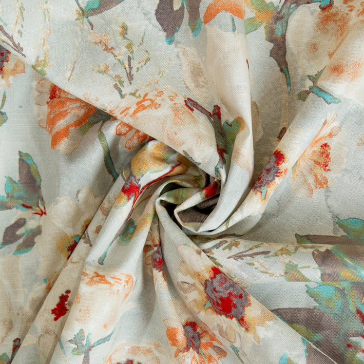 Sunray Stalks is a hazy Summery floral print with watercolour orange and white flowers over a faded green/grey background.