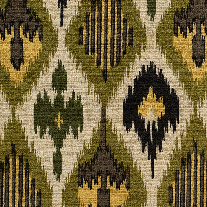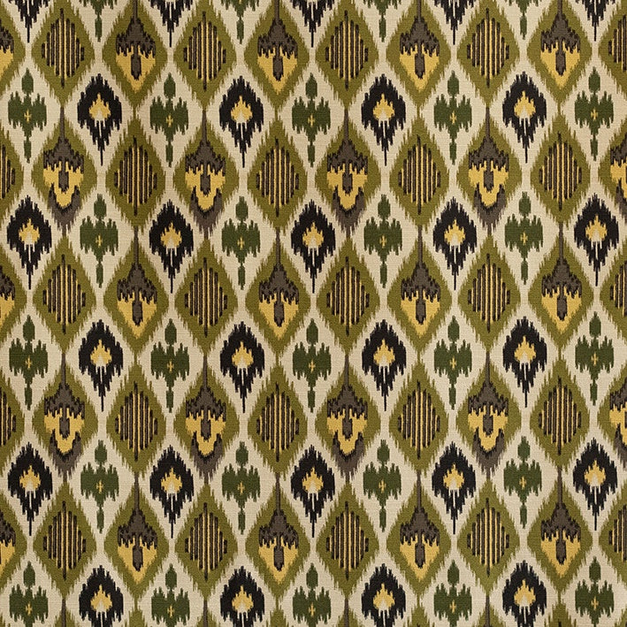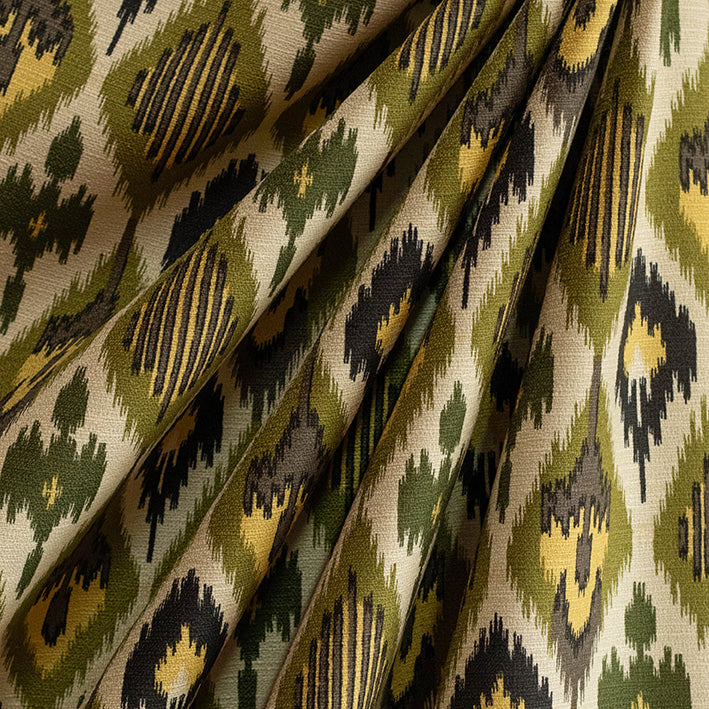 This luscious forest green, khaki, grey, black, cream and custard coloured Ikat print makes a subtle statement.