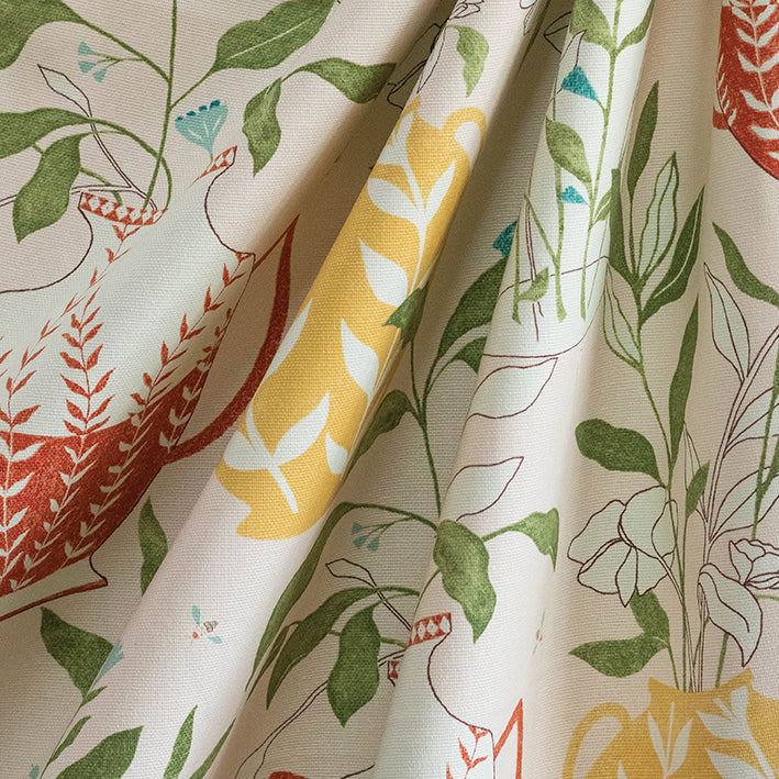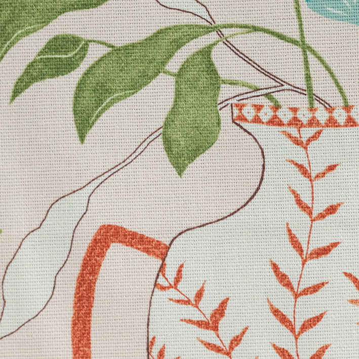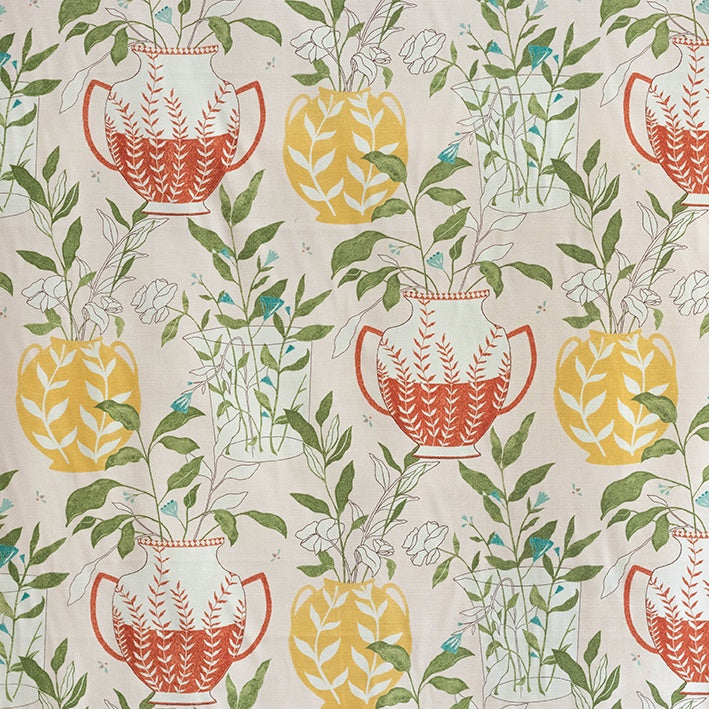 This light pinky clay fabric feautres ornamental vases and glass beakers with delicate blue and white flowers sprouting out of them. Little bees are dotted around this charming print! A fantastic option for occasional and everyday use upholstery, cushions and curtaining.