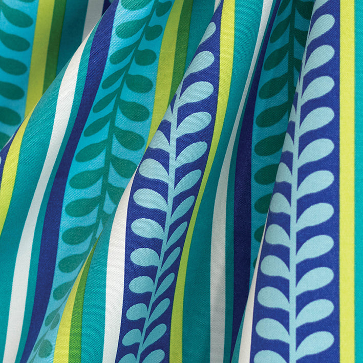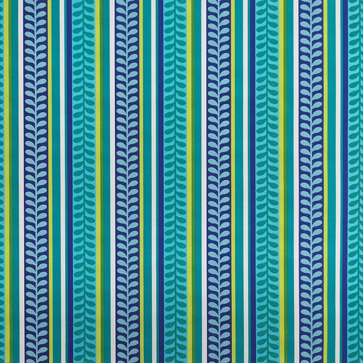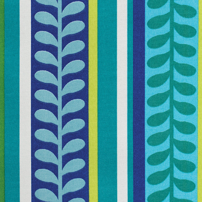 Blue Buds is a playful retro outdoor print featuring stripes of navy, white, lime and grass green with cute colbalt and sky blue stems running alongside. This fabric is water-resistant and is the perfect choice to liven up your outdoor, or indoor, entertaining space, perfect for the patio, poolside, and other home furnishings.