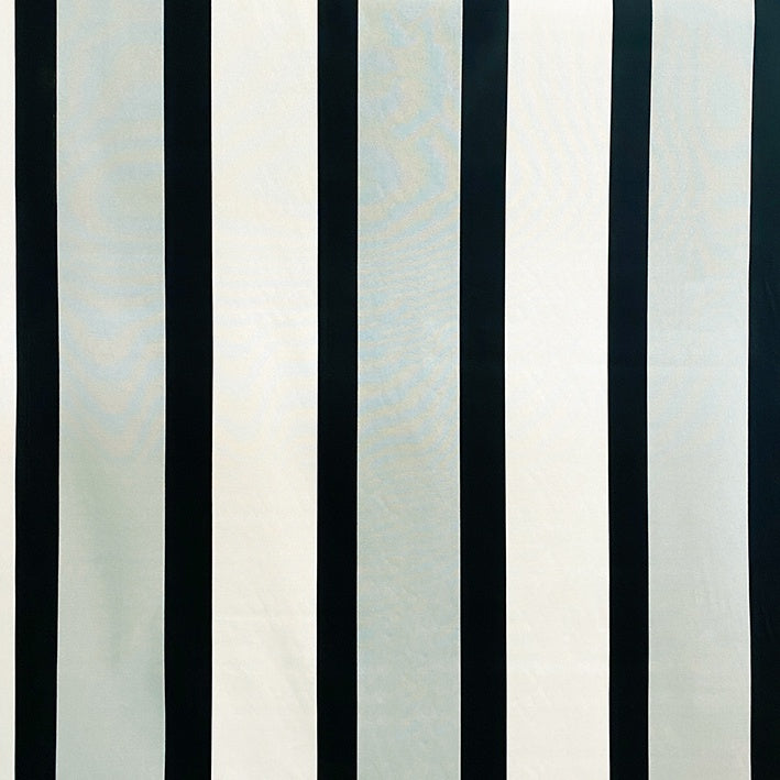 Twirl Jumbo, designed by Diane Von Furstenberg, is a classic, largescale stripe in a soft blue and white, separated with narrower black stripes. Printed on a medium-weight cotton base cloth this fabric is a great choice for statement curtains, blinds, medium use upholstery projects, or as a coordinating pattern for throw cushions.