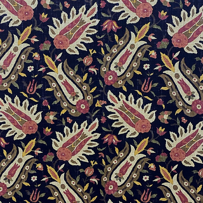 A fantastic contemporary paisley-esque print in fantastic pink and gold colours on a dark colourway. Printed on a Linen/Viscose base cloth it has a fantastic drape for curtaining and is perfect for light use upholstery and throw cushions.