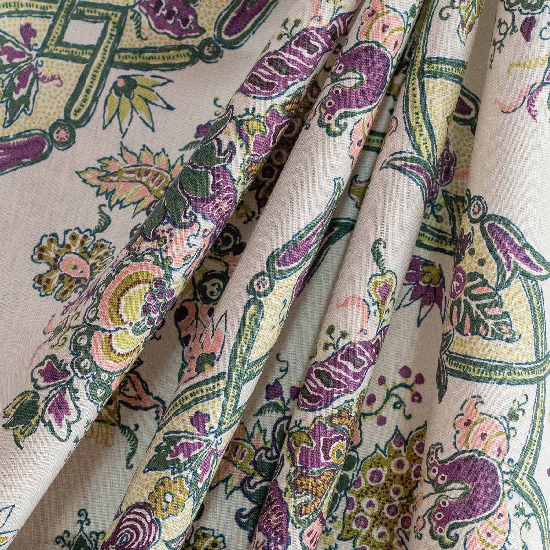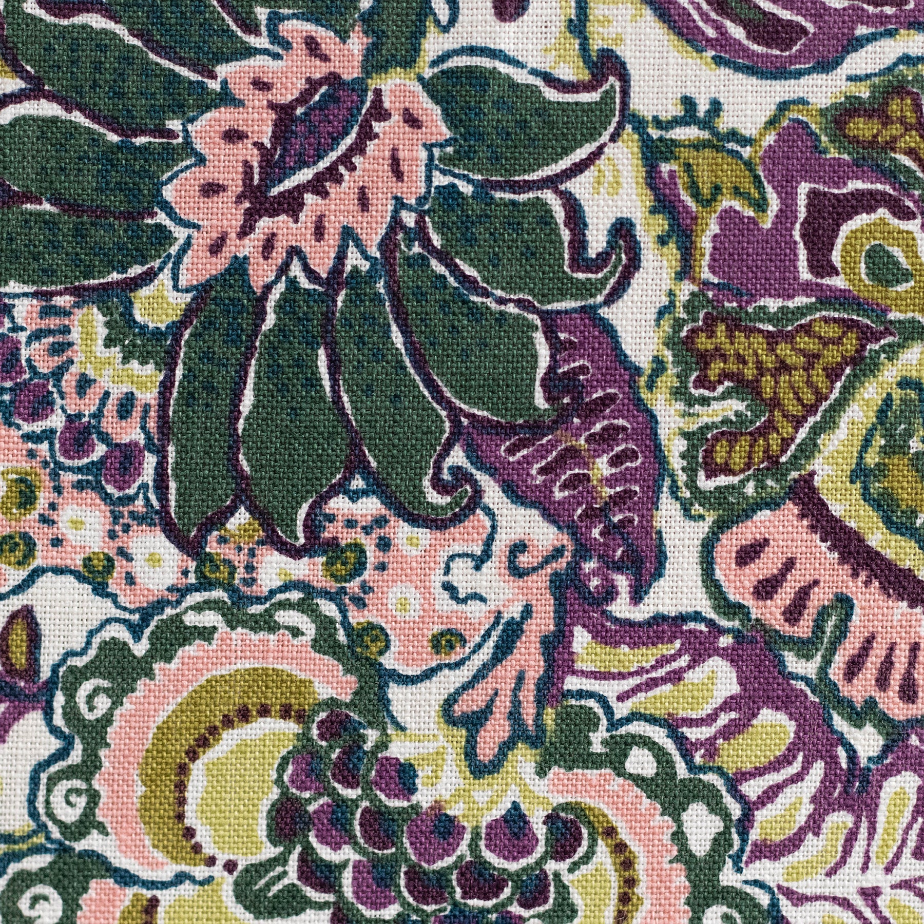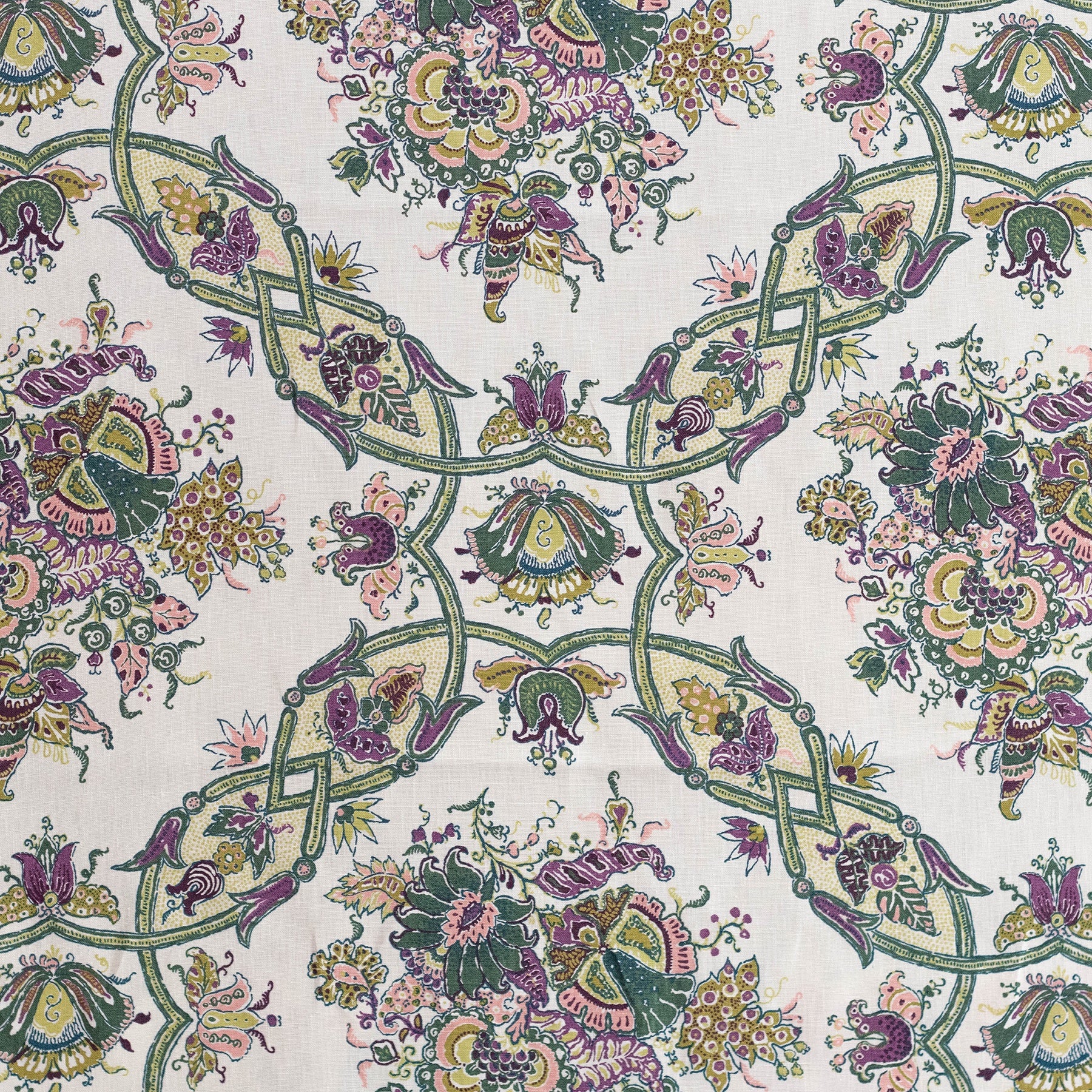 Florabunda Grape is a gorgeous botanical floral linen featuring giant green, pink and purple blooms and lattices over a white background.
