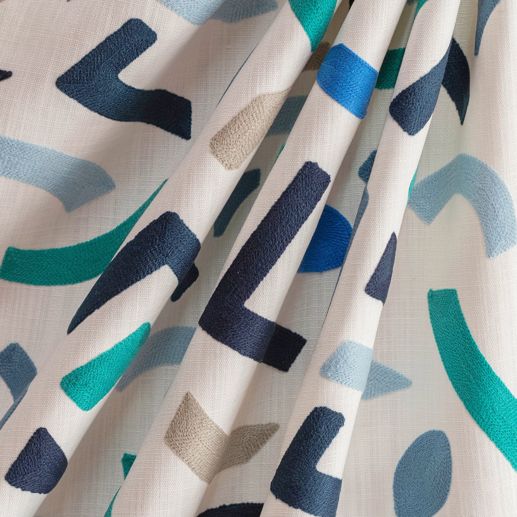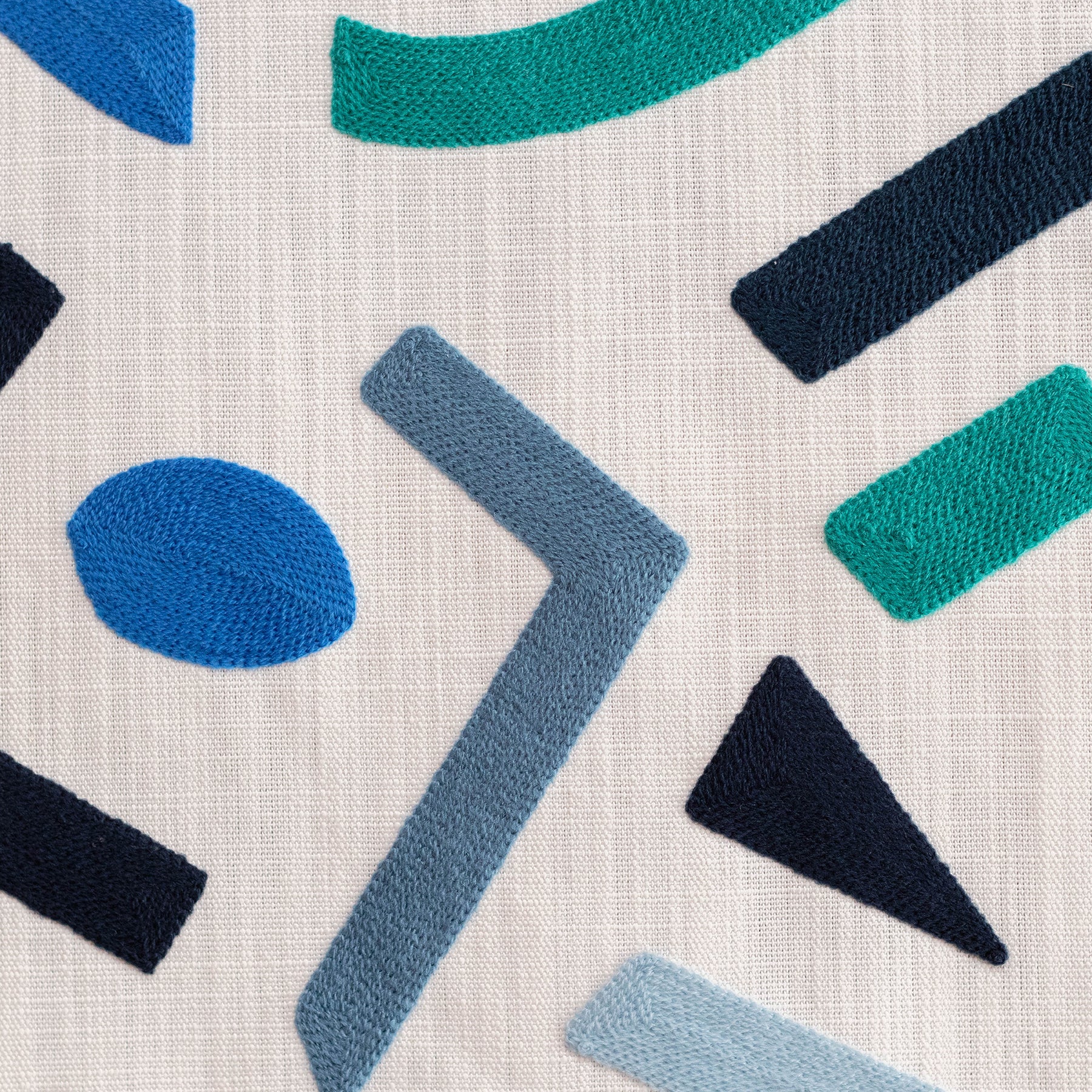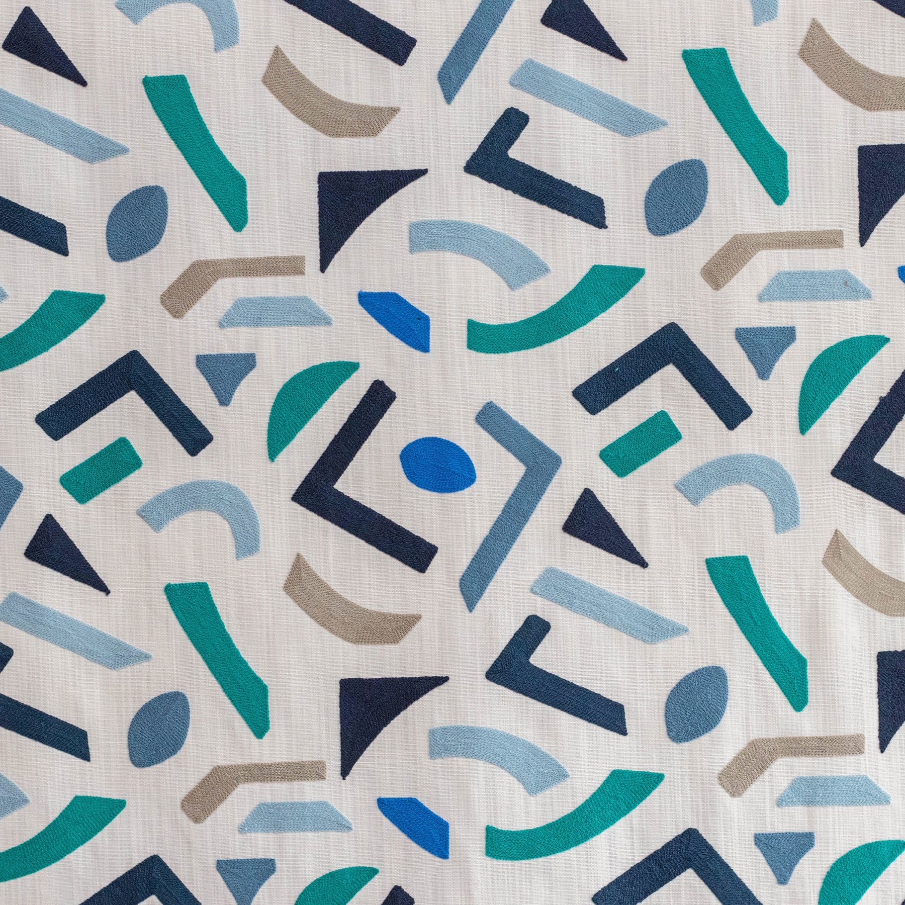 Make a statement with this bright and playful fabric featuring embroidered sky blue, teal, electric blue and navy geometric shapes dotted throughout.