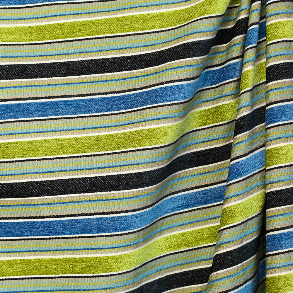 A wonderfully textured heavyweight jacquard upholstery fabric that features raised chenille stripes in sky blue, citron green, gray, and beige.  Jacquard woven fabrics feature multi-colored patterns that are woven into the fabric this increases the durability making it a fantastic choice for all your furniture projects. Can also be used for heavy statement curtains.