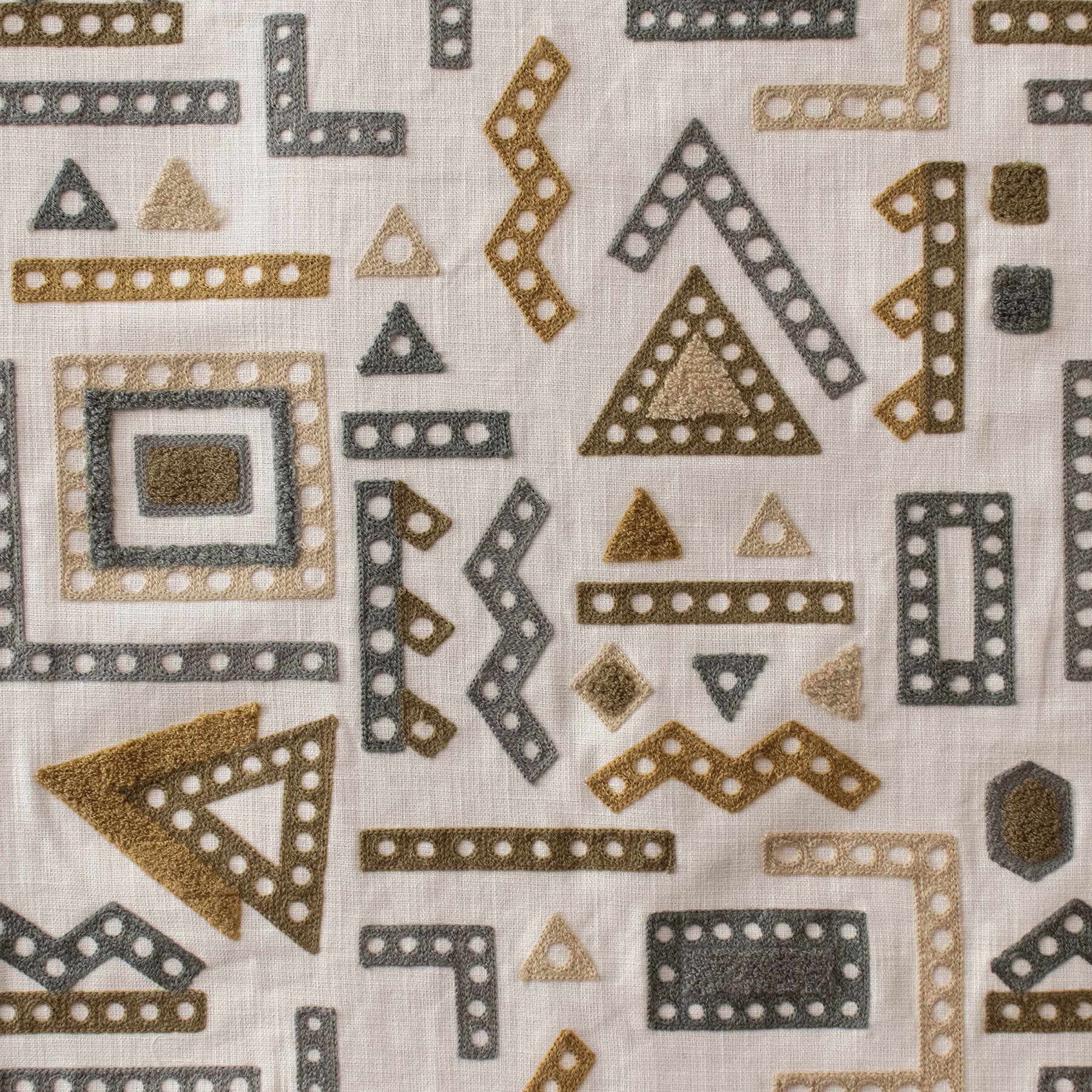 Meccano Biscuit celebrates timeless charm with a fresh, playful twist. With geometric shapes embroidered in a spectrum of neutrals, from honey and caramel to greys, creating a layered, textured effect that feels both natural and exciting. Perfect for cushions, curtains, or occasional upholstery. Biscuit is ideal for creating cozy, inviting spaces with a subtle, artisanal charm.