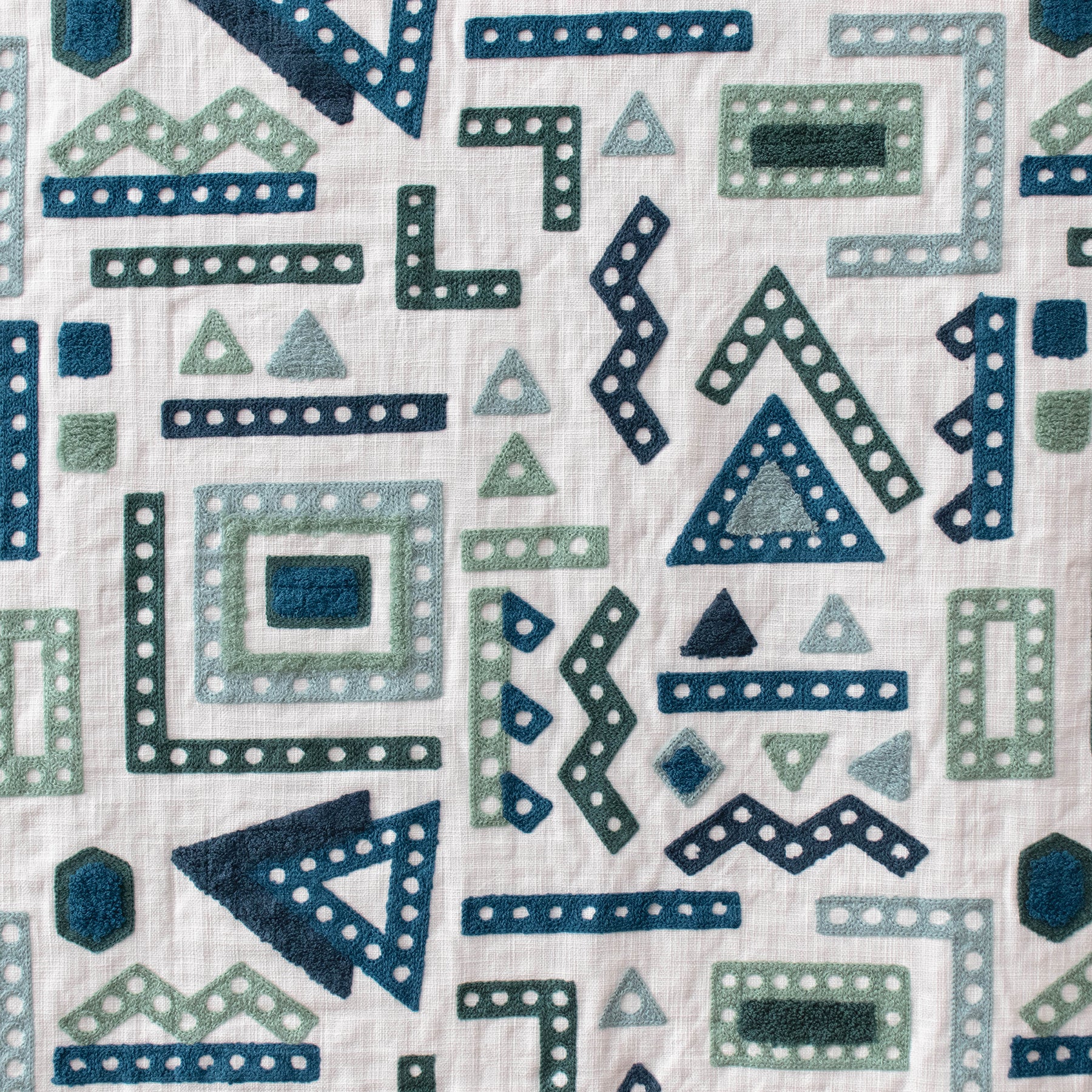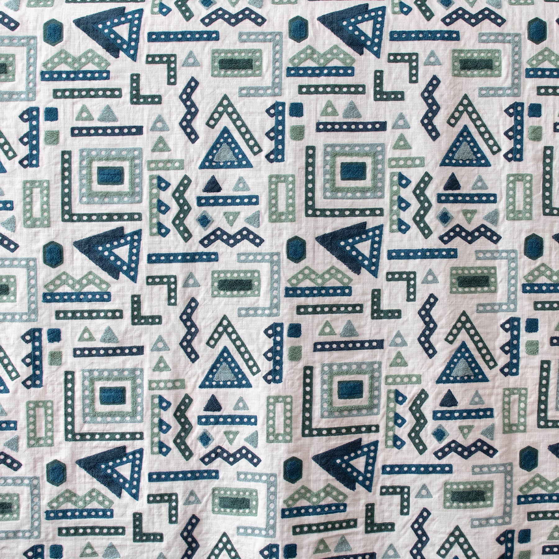 Meccano Peacock brings crisp, vibrant energy to interiors with its playful geometric embroidery. On a clean white backdrop, different shapes are stitched in a spectrum of blues, creating a lively, layered texture that catches the eye. Perfect for cushions, curtains, or occasional upholstery. This fabric offers a cheerful, contemporary feel.