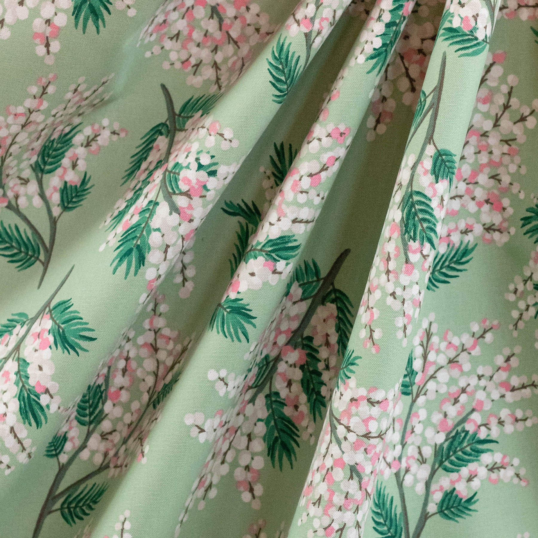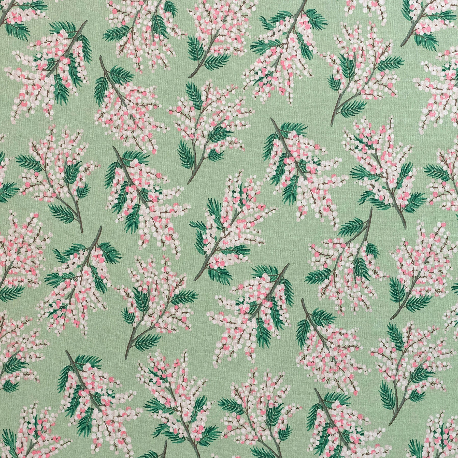 This soft minty sage fabric feautures pink, grey and white mimosa flower sprigs scattered over the top.