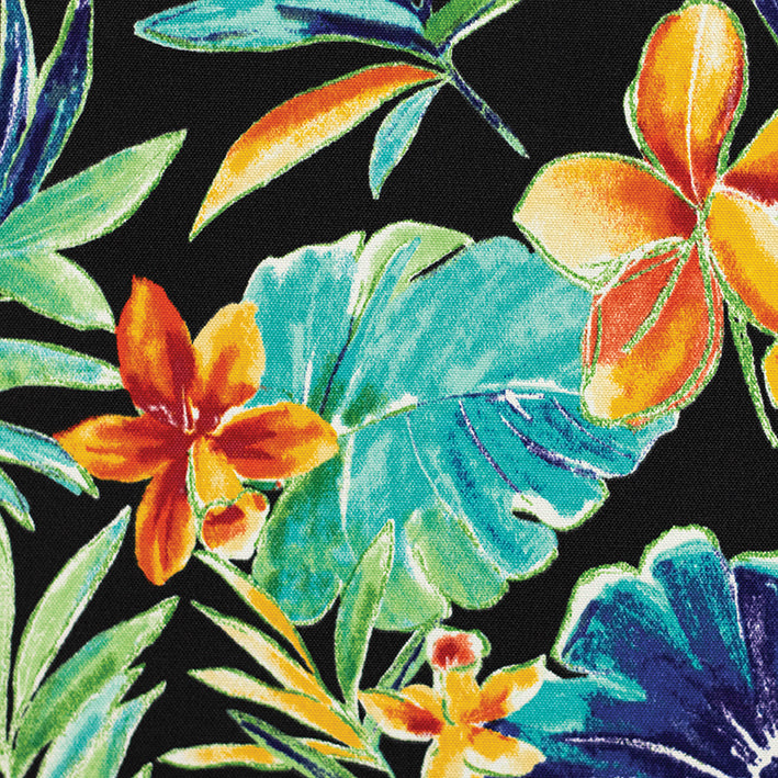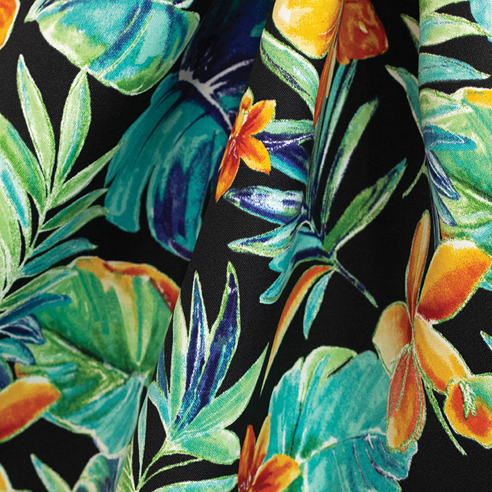 Neon Tropics is the life of the party! Luminous blue and green leaves glow underneath vibrant orange flowers on a black background in this bold outdoor print. This fabric is water-resistant and is the perfect choice to liven up your outdoor, or indoor, entertaining space, perfect for the patio, poolside, and other home furnishings.