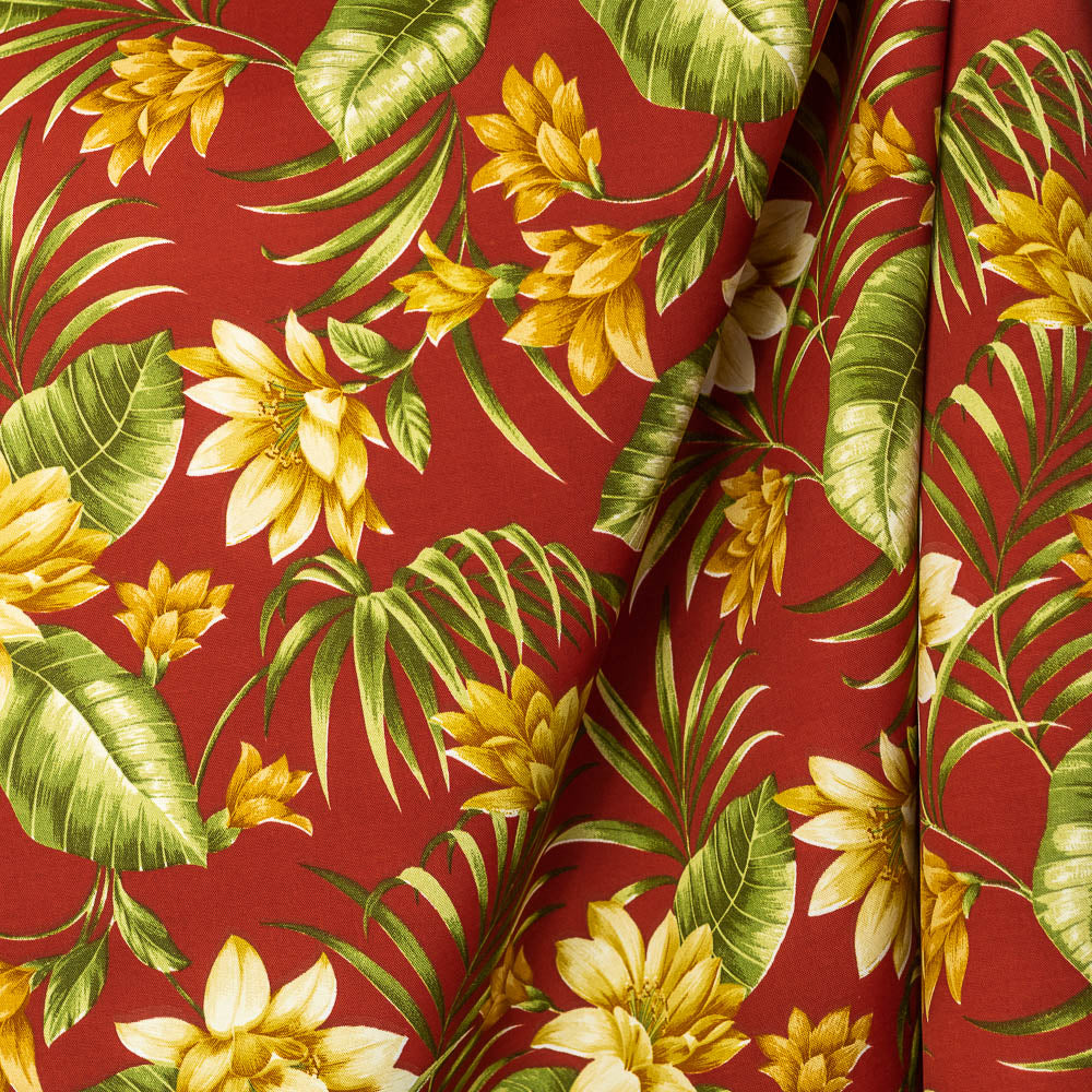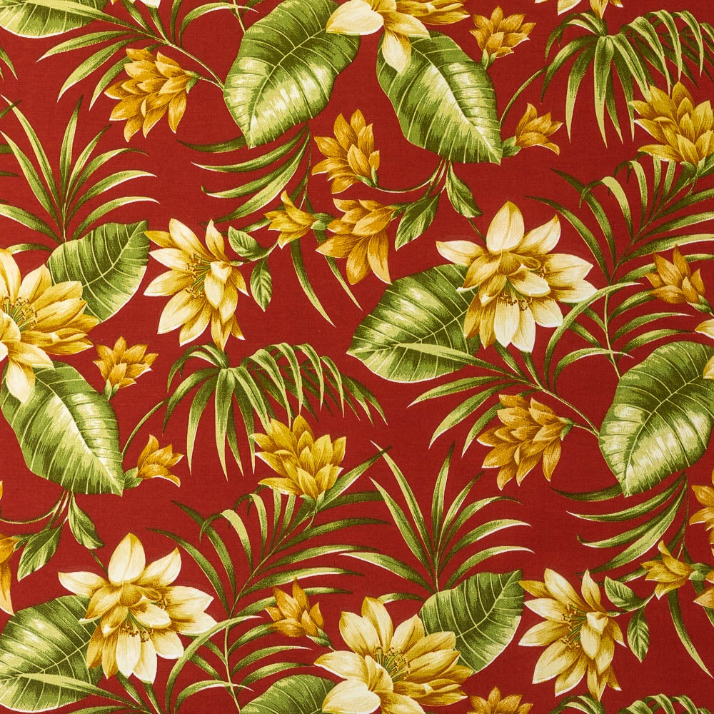 Nicholas is a bright indoor/ outdoor fabric featuring yellow gold flowers and green leaves set against a deep red background. This fabric is water-resistant and is the perfect choice to liven up your outdoor, or indoor, entertaining space, perfect for the patio, poolside, and other home furnishings.